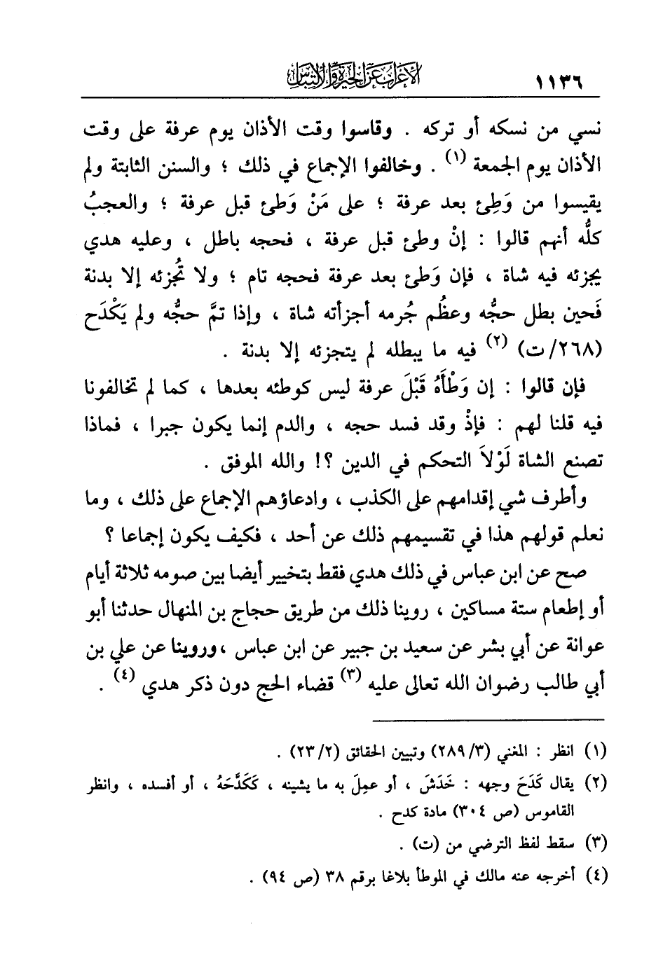 نسي من نسكه أو تركه. وقاسوا وقت الأذان يوم عرفة على وقت الأذان يوم الجمعة (¬١). وخالفوا الإجماع في ذلك؛ والسنن الثابتة ولم يقيسوا من وَطِئ بعد عرفة؛ على مَنْ وَطئ قبل عرفة؛ والعجبُ كلُّه أنهم قالوا: إنْ وطئ قبل عرفة، فحجه باطل، وعليه هدي يجزئه فيه شاة، فإن وَطئ بعد عرفة فحجه تام؛ ولا تُجزئه إلا بدنة فَحين بطل حجُّه وعظُم جُرمه أجزأته شاة، وإذا تمَّ حجُّه ولم يَكْدَح (¬٢) فيه ما يبطله لم يتجزئه إلا بدنة.
