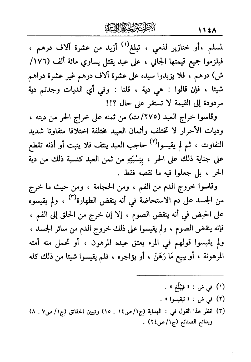 وقاسوا خراج العبد من ثمنه على خراج الحر من ديته، وديات الأحرار لا تختلف وأثمان العبيد مختلفة اختلافا متفاوتا شديد التفاوت، ثم لم يقيسوا (¬٢) حاجب العبد ينتف فلا ينبت أو أذنه تقطع على جناية ذلك على الحر، بِنِسْبَتِهِ من ثمن العبد كنسبة ذلك من دية الحر، بل جعلوا فيه ما نقصه فقط.