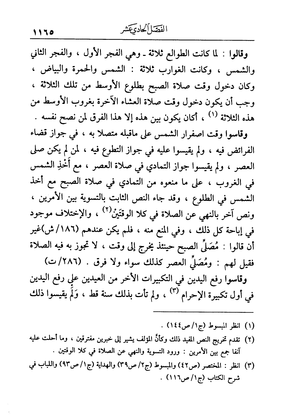 وقالوا: لما كانت الطوالع ثلاثة - وهي الفجر الأول، والفجر الثاني والشمس، وكانت الغوارب ثلاثة: الشمس والحمرة والبياض، وكان دخول وقت صلاة الصبح بطلوع الأوسط من تلك الثلاثة، وجب أن يكون دخول وقت صلاة العشاء الآخرة بغروب الأوسط من هذه الثلاثة (¬١)، أكان يكون بين هذه إلا هذا الفرق لمن نصح نفسه.