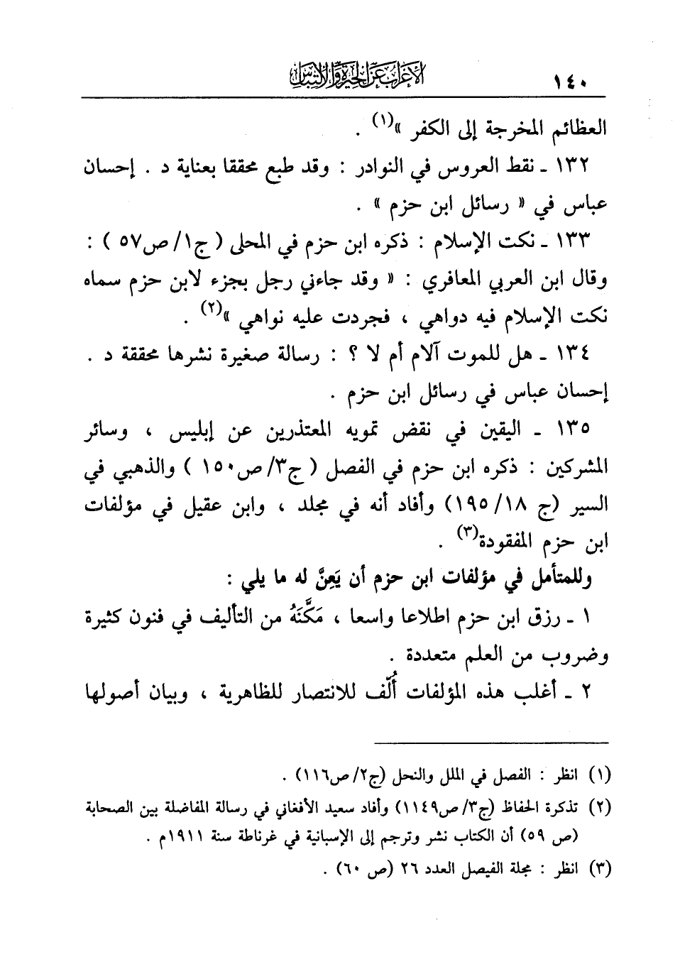 ١٣٤ - هل للموت آلام أم لا؟ : رسالة صغيرة نشرها محققة د. إحسان عباس في رسائل ابن حزم.