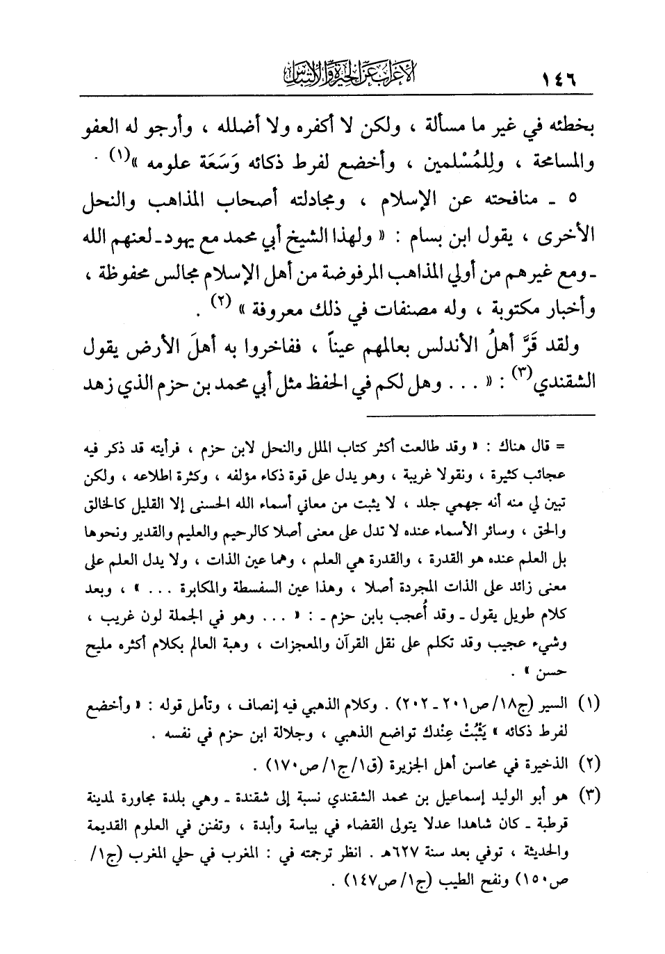 (¬١) السير (ج ١٨/ ص ٢٠١ - ٢٠٢). وكلام الذهبي فيه إنصاف، وتأمل قوله: "وأخضع لفرط ذكائه" يَثْبُتْ عِنْدك تواضع الذهبي، وجلالة ابن حزم في نفسه.
