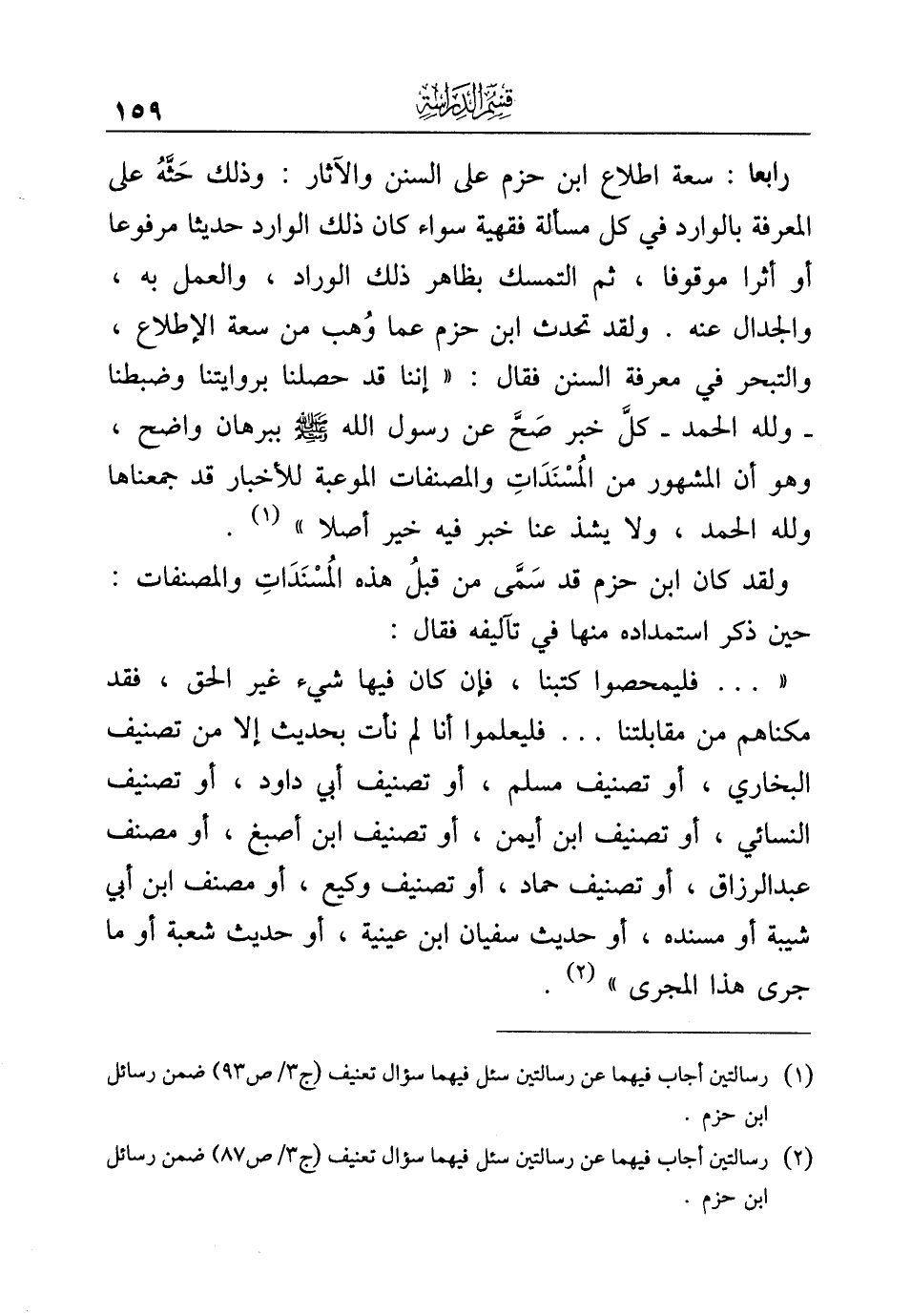 ¬رابعا: سعة اطلاع ابن حزم على السنن والآثار: وذلك حَثَّهُ على المعرفة بالوارد في كل مسألة فقهية سواء كان ذلك الوارد حديثا مرفوعا أو أثرا موقوفا، ثم التمسك بظاهر ذلك الوارد، والعمل به، والجدال عنه. ولقد تحدث ابن حزم عما وُهب من سعة الإطلاع، والتبحر في معرفة السنن فقال: "إننا قد حصلنا بروايتنا وضبطنا - ولله الحمد - كلَّ خبر صَحَّ عن رسول الله - صلى الله عليه وسلم - ببرهان واضح، وهو أن المشهور من المُسْنَدَاتِ والمصنفات الموعبة للأخبار قد جمعناها ولله الحمد، ولا يشذ عنا خبر فيه خير أصلا" (¬١).
