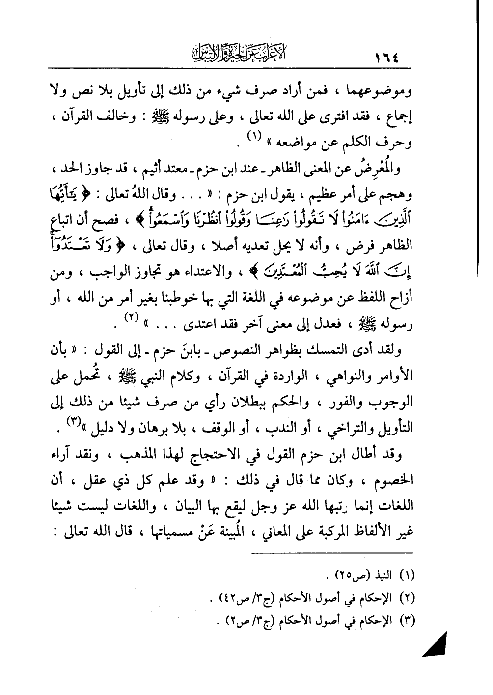 ولقد أدى التمسك بظواهر النصوص - بابنَ حزم - إلى القول: "بأن الأوامر والنواهي، الواردة في القرآن، وكلام النبي - صلى الله عليه وسلم -، تُحمل على الوجوب والفور، والحكم ببطلان رأي من صرف شيئا من ذلك إلى التأويل والتراخي، أو الندب، أو الوقف، بلا برهان ولا دليل" (¬٣).