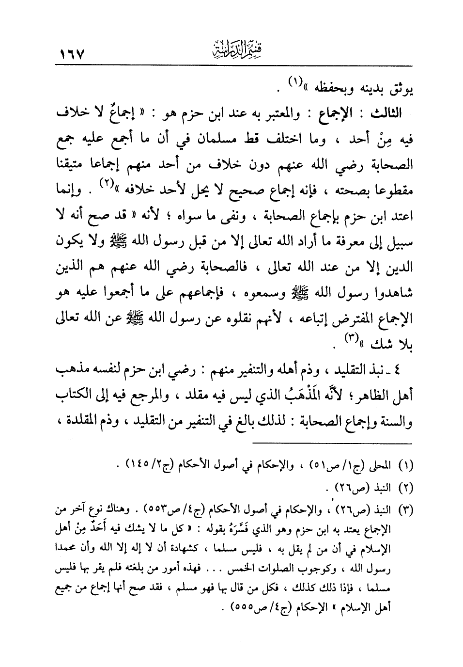 (¬٣) النبذ (ص ٢٦)، والإحكام في أصول الأحكام (ج ٤/ ص ٥٥٣). وهناك نوع آخر من الإجماع يعتد به ابن حزم وهو الذي فَسَّرَهُ بقوله: "كل ما لا يشك فيه أَحَدٌ مِنْ أهل الإسلام في أن من لم يقل به، فيس مسلما، كشهادة أن لا إله إلا الله وأن محمدا رسول الله، وكوجوب الصلوات الخمس. . . فهذه أمور من بلغته فلم يقر بها فليس مسلما، فإذا ذلك كذلك، فكل من قال بها فهو مسلم، فقد صح أنها إجماع من جميع أهل الإسلام" الإحكام (ج ٤/ ص ٥٥٥).