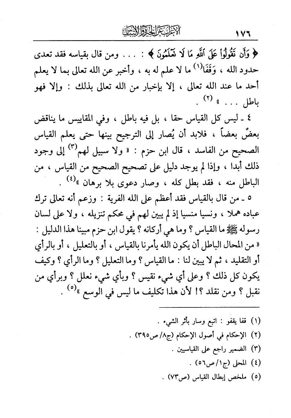 ¬{وَأَنْ تَقُولُوا عَلَى اللَّهِ مَا لَا تَعْلَمُونَ}: . . . ومن قال بقياسه فقد تعدى حدود الله، وَقَفَا (¬١) ما لا علم له به، وأخبر عن الله تعالى بما لا يعلم أحد ما عند الله تعالى، إلا بإخبار من الله تعالى بذلك: وإلا فهو باطل. . ." (¬٢).