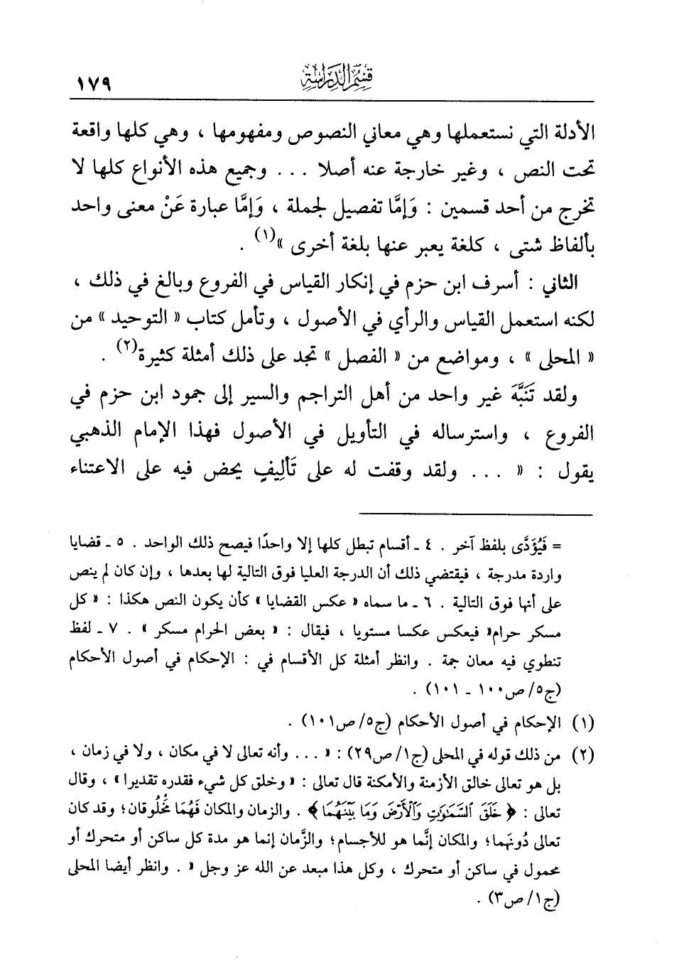 (¬٢) من ذلك قوله في المحلى (ج ١/ ص ٢٩): ". . . وأنه تعالى لا في مكان، ولا في زمان, بل هو تعالى خالق الأزمنة والأمكنة قال تعالى: "وخلق كل شيء فقدره تقديرا", وقال تعالى: {خَلَقَ السَّمَاوَاتِ وَالْأَرْضَ وَمَا بَيْنَهُمَا}. والزمان والمكان فَهُمَا مَخْلُوقان؛ وقد كان تعالى دُونَهما؛ والمكان إنَّما هو للأجسام؛ والزَّمان إنما هو مدة كل ساكن أو متحرك أو محمول في ساكن أو متحرك، وكل هذا مبعد عن الله عز وجل". وانظر أيضًا المحلى (ج ١/ ص ٣).