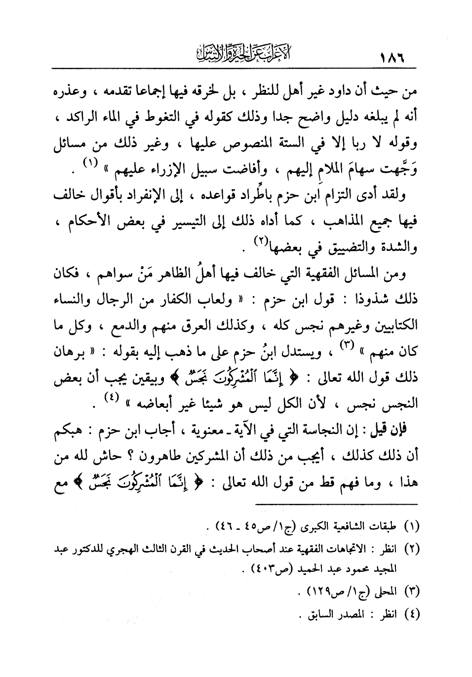 ¬من حيث أن داود غير أهل للنظر، بل لخرقه فيها إجماعا تقدمه، وعذره أنه لم يبلغه دليل واضح جدا وذلك كقوله في التغوط في الماء الراكد، وقوله لا ربا إلا في الستة المنصوص عليها، وغير ذلك من مسائل وَجَّهت سهامَ الملامِ إليهم، وأفاضت سبيل الإزراء عليهم" (¬١).
