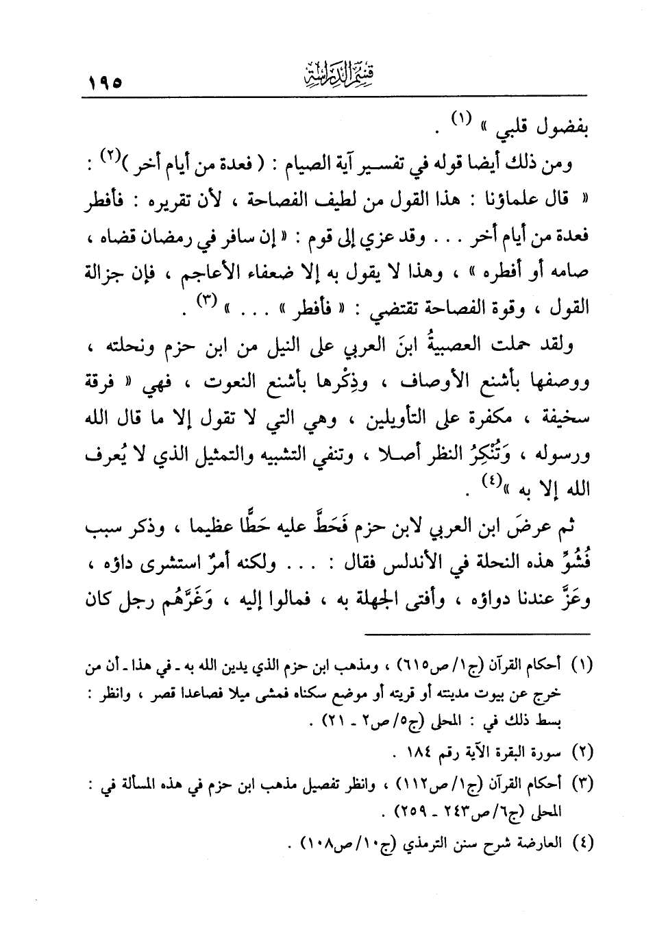 ومن ذلك أيضا قوله في تفسير آية الصيام: {فَعِدَّةٌ مِنْ أَيَّامٍ أُخَرَ} (¬٢): "قال علماؤنا: هذا القول من لطيف الفصاحة، لأن تقريره: فأفطر فعدة من أيام أخر. . . وقد عزي إلى قوم: "إن سافر في رمضان قضاه، صامه أو أفطره"، وهذا لا يقول به إلا ضعفاء الأعاجم، فإن جزالة القول، وقوة الفصاحة تقتضي: "فأفطر". . ." (¬٣).