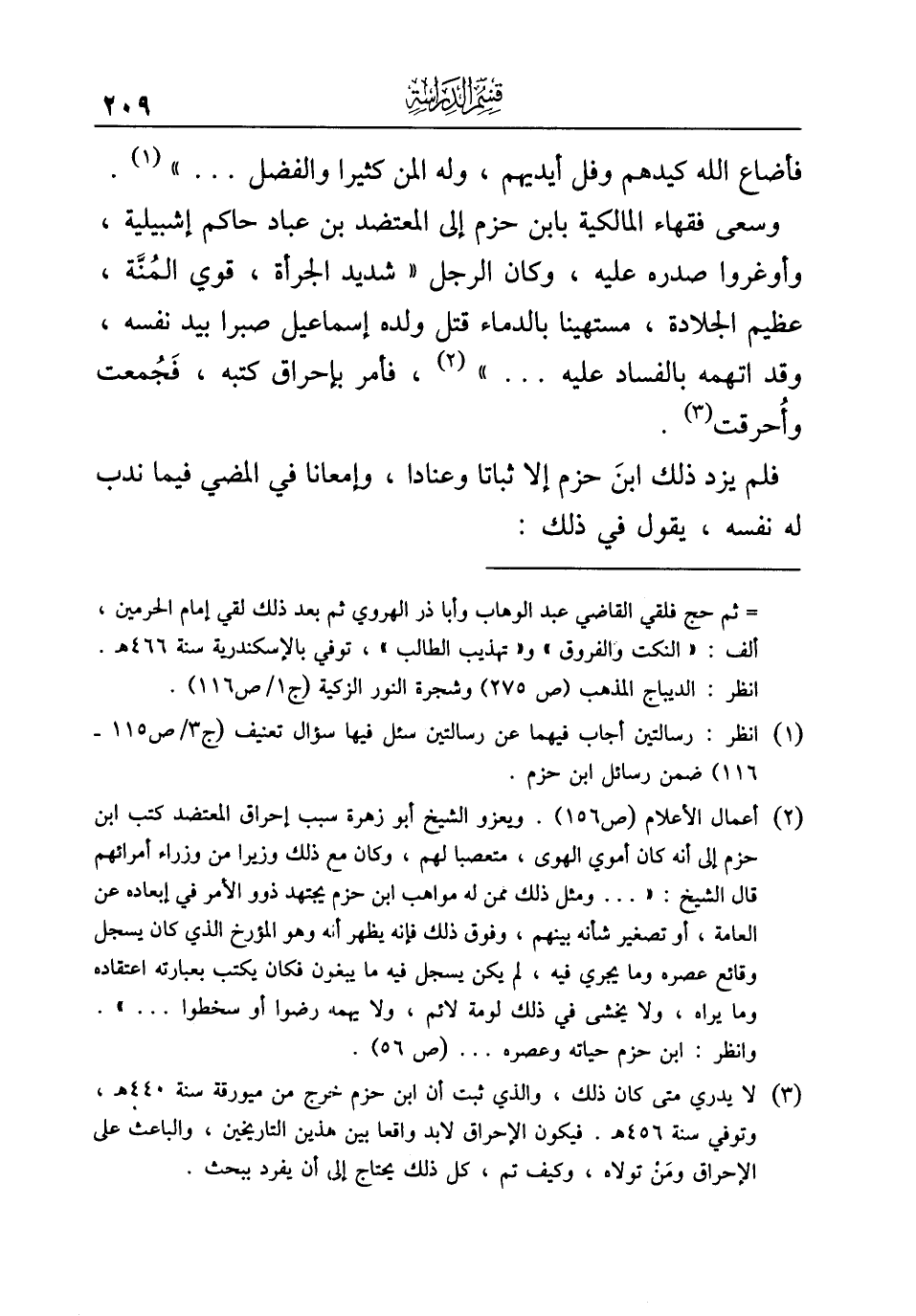 (¬٢) أعمال الأعلام (ص ١٥٦). ويعزو الشيخ أبو زهرة سبب إحراق المعتضد كتب ابن حزم إلى أنه كان أموي الهوى، متعصبا لهم، وكان مع ذلك وزيرا من وزراء أمرائهم قال الشيخ: ". . . ومثل ذلك ممن له مواهب ابن حزم يجتهد ذوو الأمر في إبعاده عن العامة، أو تصغير شأنه بينهم، وفوق ذلك فإنه يظهر أنه وهو المؤرخ الذي كان يسجل وقائع عصره وما يجري فيه، لم يكن يسجل فيه ما يبغون فكان يكتب بعبارته اعتقاده وما يراه، ولا يخشى في ذلك لومة لائم، ولا يهمه رضوا أو سخطوا. . ." وانظر: ابن حزم حياته وعصره. . . (ص ٥٦).