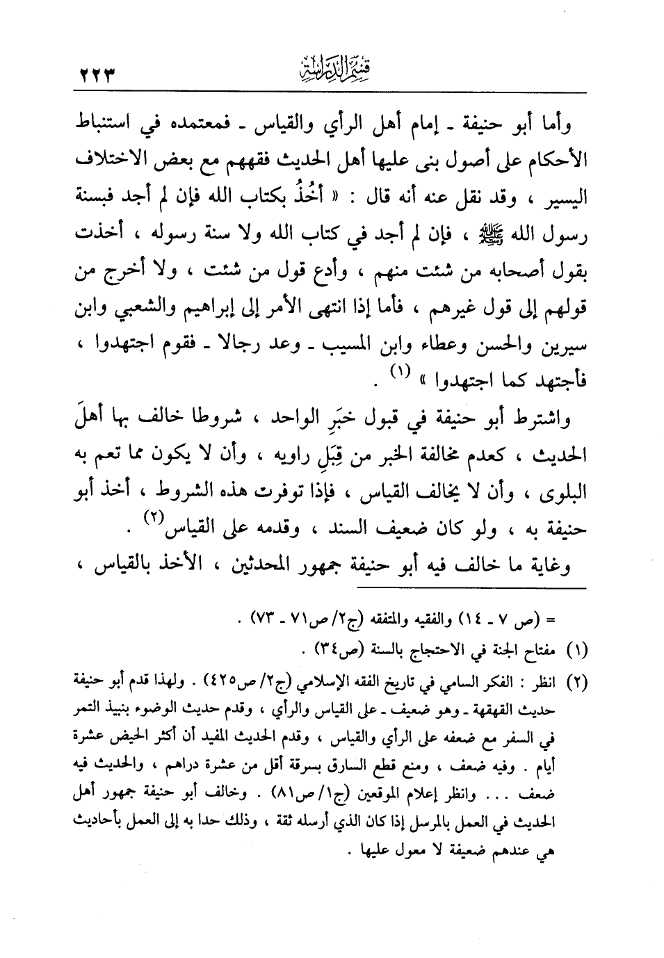 (¬٢) انظر: الفكر السامي في تاريخ الفقه الإسلامي (ج ٢/ ص ٤٢٥). ولهذا قدم أبو حنيفة حديث القهقهة - وهو ضعيف - على القياس والرأي، وقدم حديث الوضوء بنبيذ التمر في السفر مع ضعفه على الرأي والقياس، وقدم الحديث المفيد أن أكثر الحيض عشرة أيام. وفيه ضعف، ومنع قطع السارق بسرقة أقل من عشرة دراهم، والحديث فيه ضعف. . . وانظر إعلام الموقعين (ج ١/ ص ٨١). وخالف أبو حنيفة جمهور أهل الحديث في العمل بالمرسل إذا كان الذي أرسله ثقة، وذلك حدا به إلى العمل بأحاديث هي عندهم ضعيفة لا معول عليها.