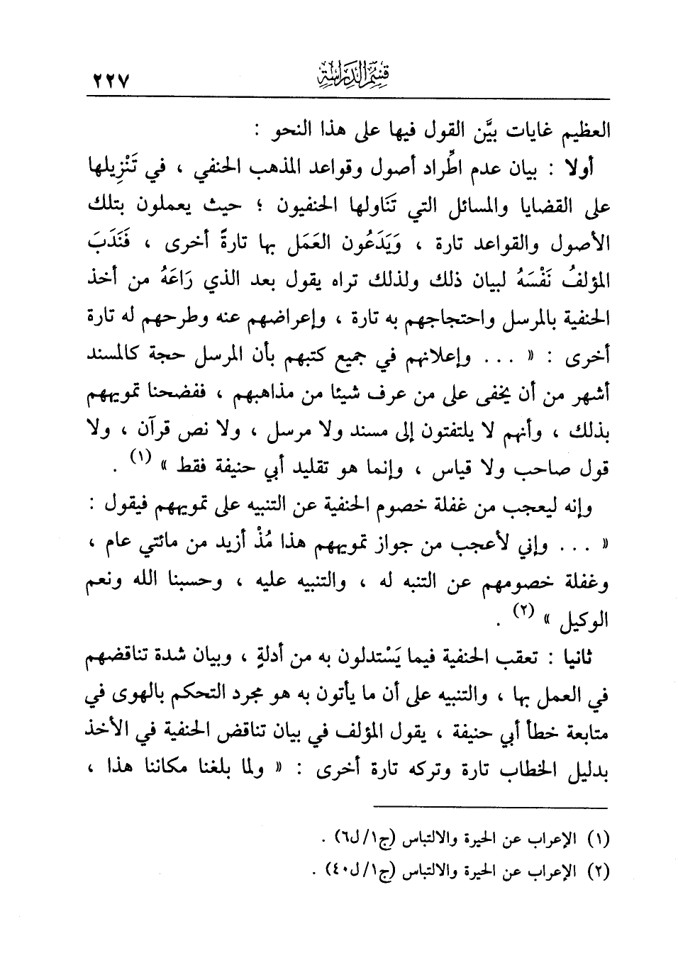 ثانيا: تعقب الحنفية فيما يَسْتدلون به من أدلةٍ، وبيان شدة تناقضهم في العمل بها، والتنبيه على أن ما يأتون به هو مجرد التحكم بالهوى في متابعة خطأ أبي حنيفة، يقول المؤلف في بيان تناقض الحنفية في الأخذ بدليل الخطاب تارة وتركه تارة أخرى: "ولما بلغنا مكاننا هذا،