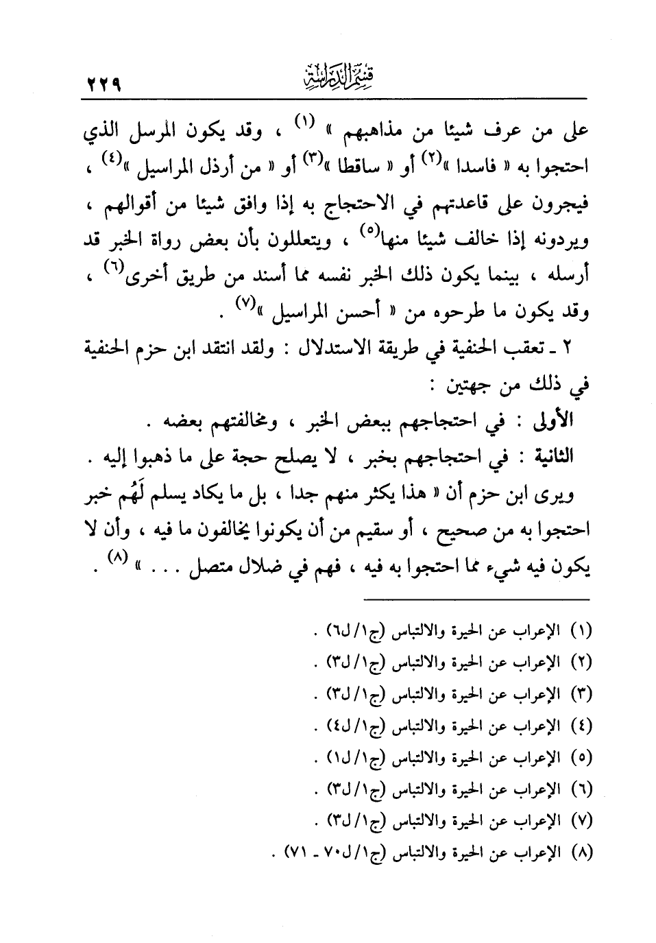 ¬على من عرف شيئا من مذاهبهم" (¬١)، وقد يكون المرسل الذي احتجوا به "فاسدا" (¬٢) أو "ساقطا" (¬٣) أو "من أرذل المراسيل" (¬٤)، فيجرون على قاعدتهم في الاحتجاج به إذا وافق شيئا من أقوالهم، ويردونه إذا خالف شيئا منها (¬٥)، ويتعللون بأن بعض رواة الخبر قد أرسله، بينما يكون ذلك الخبر نفسه مما أسند من طريق أخرى (¬٦)، وقد يكون ما طرحوه من "أحسن المراسيل" (¬٧).