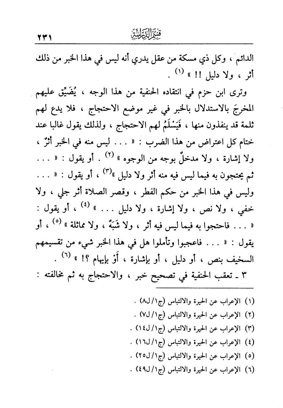 وترى ابن حزم في انتقاده الحنفية من هذا الوجه، يُضَيِّق عليهم المخرجَ بالاستدلال بالخبر في غير موضع الاحتجاج، فلا يدع لهم ثلمة قد ينفذون منها، فَيَسْلَمُ لهم الاحتجاج، ولذلك يقول غالبا عند ختام كل اعتراض من هذا الضرب: ". . . ليس منه في الخبر أثرٌ، ولا إشارة، ولا مدخلٌ بوجه من الوجوه" (¬٢). أو يقول: ". . . ثم يحتجون به فيما ليس فيه منه أثر ولا دليل" (¬٣)، أو يقول: ". . . وليس في هذا الخبر من حكم الفطر، وقصر الصلاة أثر جلي، ولا خفي، ولا نص، ولا إشارة، ولا دليل. . ." (¬٤)، أو يقول: ". . . فاحتجوا به فيما ليس فيه أثر، ولا شَبَهٌ، ولا مماثلة" (¬٥)، أو يقول: ". . . فاعجبوا وتأملوا هل في هذا الخبر شيء من تقسيمهم السخيف بنص، أو دليل، أو بإشارة، أَوْ بإيهام؟ ! " (¬٦).