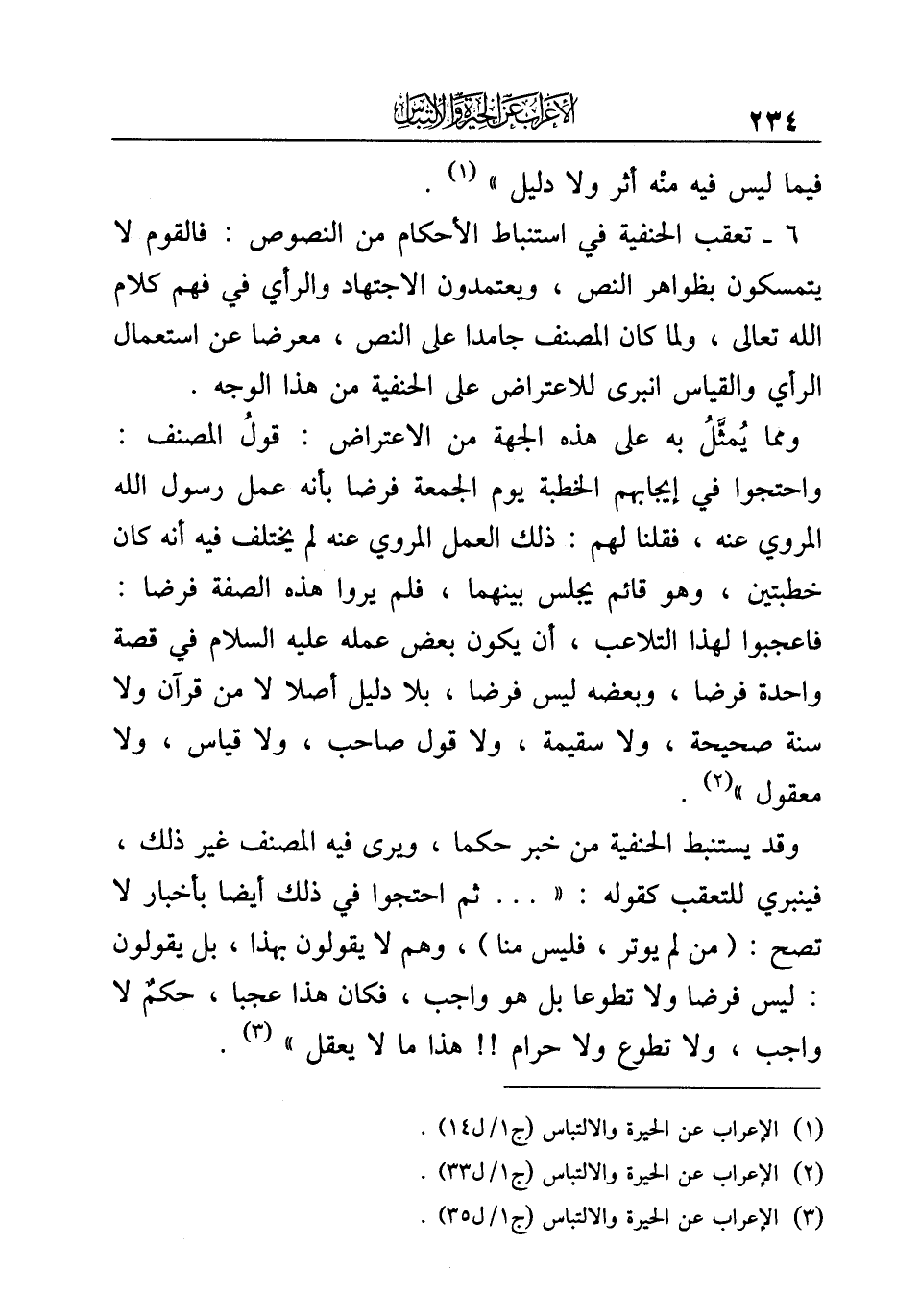 وقد يستنبط الحنفية من خبر حكما، ويرى فيه المصنف غير ذلك، فينبري للتعقب كقوله: ". . . ثم احتجوا في ذلك أيضا بأخبار لا تصح: (من لم يوتر، فليس منا)، وهم لا يقولون بهذا، بل يقولون: ليس فرضا ولا تطوعا بل هو واجب، فكان هذا عجبا، حكمٌ لا واجب، ولا تطوع ولا حرام! ! هذا ما لا يعقل" (¬٣).