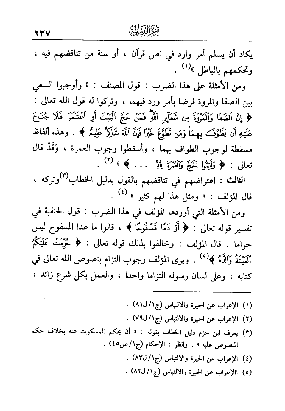 ومن الأمثلة على هذا الضرب: قول المصنف: "وأوجبوا السعي بين الصفا والمروة فرضا بأمر ورد فيهما، وتركوا له قول الله تعالى: {إِنَّ الصَّفَا وَالْمَرْوَةَ مِنْ شَعَائِرِ اللَّهِ فَمَنْ حَجَّ الْبَيْتَ أَوِ اعْتَمَرَ فَلَا جُنَاحَ عَلَيْهِ أَنْ يَطَّوَّفَ بِهِمَا وَمَنْ تَطَوَّعَ خَيْرًا فَإِنَّ اللَّهَ شَاكِرٌ عَلِيمٌ}. وهذه ألفاظ مسقطة لوجوب الطواف بهما، وأسقطوا وجوب العمرة، وَقَدْ قال تعالى: {وَأَتِمُّوا الْحَجَّ وَالْعُمْرَةَ لِلَّهِ. . .} " (¬٢).