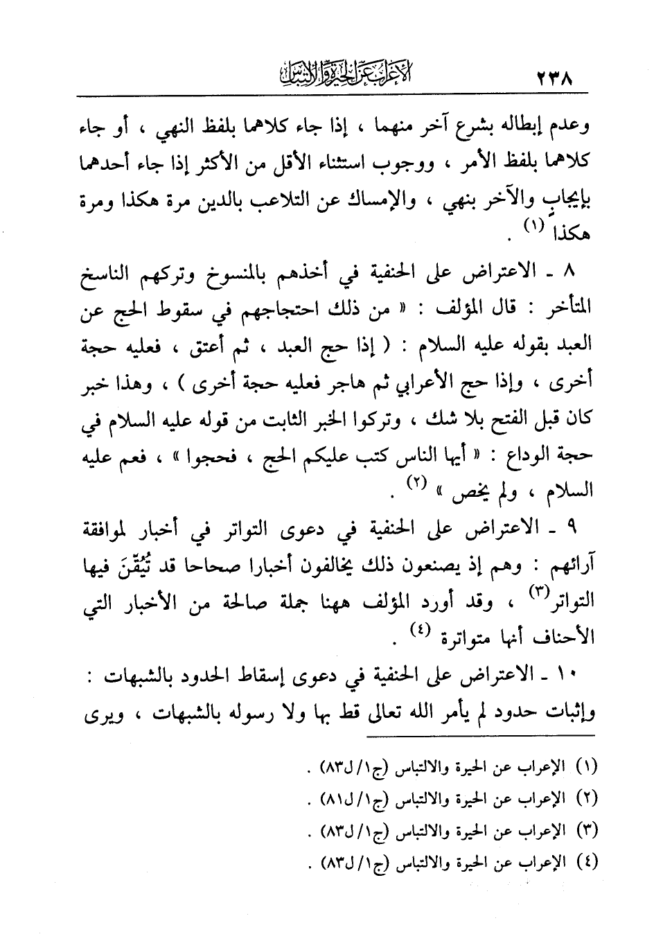 ٩ - الاعتراض على الحنفية في دعوى التواتر في أخبار لموافقة آرائهم: وهم إذ يصنعون ذلك يخالفون أخبارا صحاحا قد تُيُقّنَ فيها التواتر (¬٣)، وقد أورد المؤلف ههنا جملة صالحة من الأخبار التي الأحناف أنها متواترة (¬٤).