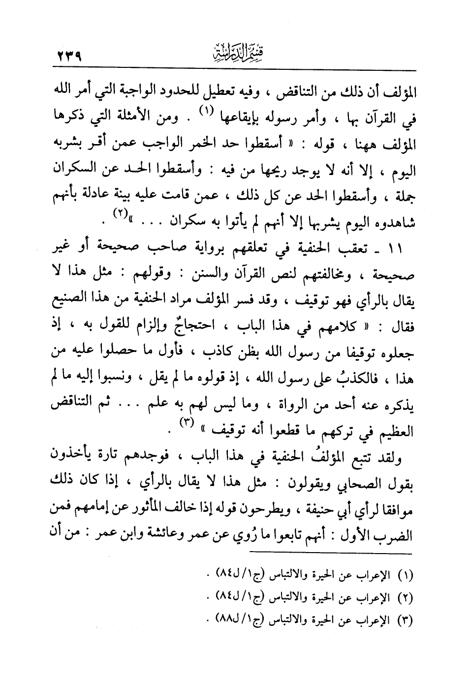 ¬المؤلف أن ذلك من التناقض، وفيه تعطيل للحدود الواجبة التي أمر الله في القرآن بها، وأمر رسوله بإيقاعها (¬١). ومن الأمثلة التي ذكرها المؤلف ههنا، قوله: "أسقطوا حد الخمر الواجب عمن أقر بشربه اليوم، إلا أنه لا يوجد ريحها من فيه: وأسقطوا الحد عن السكران جملة، وأسقطوا الحد عن كل ذلك، عمن قامت عليه بينة عادلة بأنهم شاهدوه اليوم يشربها إلا أنهم لم يأتوا به سكران. . ." (¬٢).