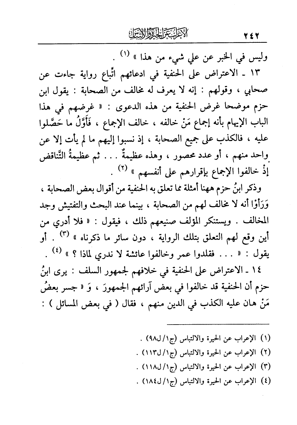 ١٤ - الاعتراض على الحنفية في خلافهم لجمهور السلف: يرى ابنُ حزم أن الحنفية قد خالفوا في بعض آرائهم الجمهورَ، وَ"جسر بعضُ مَنْ هان عليه الكذب في الدين منهم، فقال (في بعض المسائل):