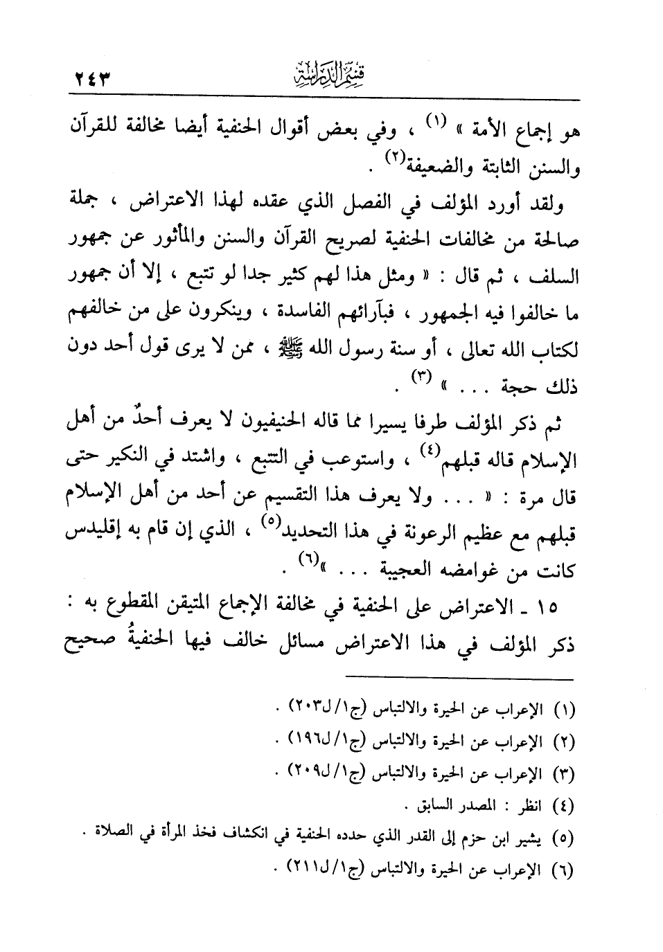 ١٥ - الاعتراض على الحنفية في مخالفة الإجماع المتيقن المقطوع به: ذكر المؤلف في هذا الاعتراض مسائل خالف فيها الحنفيةُ صحيح
