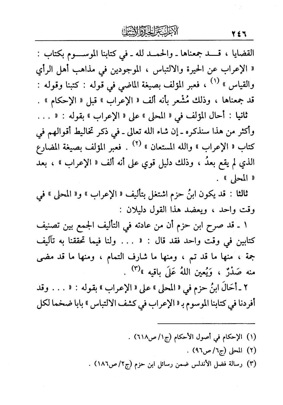 ٢ - أحَالَ ابنُ حزم في "المحلى" على "الإعراب" بقوله: ". . . وقد أفردنا في كتابنا الموسوم بـ "الإعراب في كشف الالتباس" بابا ضخما لكل