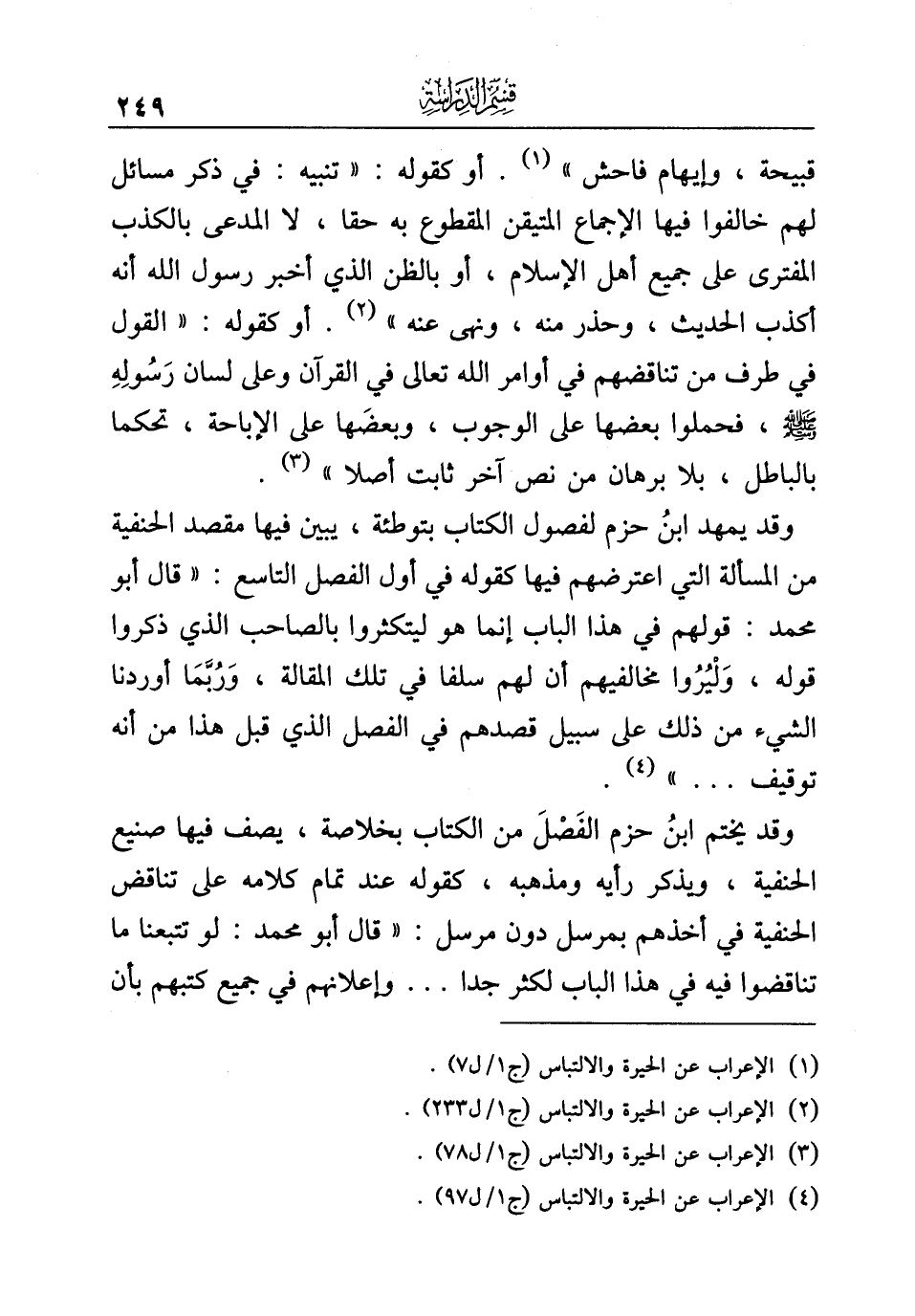وقد يختم ابنُ حزم الفَصْلَ من الكتاب بخلاصة، يصف فيها صنيع الحنفية، ويذكر رأيه ومذهبه، كقوله عند تمام كلامه على تناقض الحنفية في أخذهم بمرسل دون مرسل: "قال أبو محمد: لو تتبعنا ما تناقضوا فيه في هذا الباب لكثر جدا. . . وإعلانهم في جميع كتبهم بأن