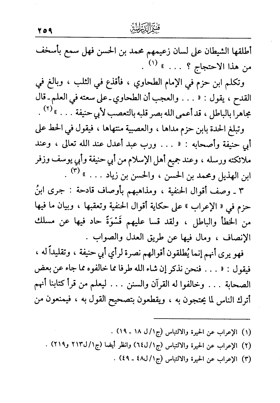 ٣ - وصف أقوال الحنفية، ومذاهبهم بأوصاف قادحة: جرى ابنُ حزم في "الإعراب" على حكاية أقوال الحنفية وتعقبها، وبيان ما فيها من الخطأ والباطل، ولقد قسا عليهم قَسْوَةً حاد فيها عن مسلك الإنصاف، ومال فيها عن طريق العدل والصواب.