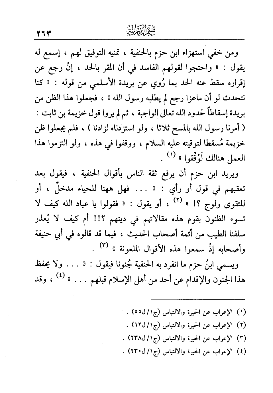 ¬ومن خفي استهزاء ابن حزم بالحنفية، تمنيه التوفيق لهم، إسمع له يقول: "واحتجوا لقولهم الفاسد في أن المقر بالحد، إنْ رجع عن إقراره سقط عنه الحد بما رُوي عن بريدة الأسلمي من قوله: "كنا نتحدث لو أن ماعزا رجع لم يطلبه رسول الله"، فجعلوا هذا الظن من بريدة إسقاطًا لحدود الله تعالى الواجبة، ثم لم يروا قول خزيمة بن ثابت: (أمرنا رسول الله بالمسح ثلاثا، ولو استزدناه لزادنا)، فلم يجعلوا ظن خزيمة مُسقطا لتوقيته عليه السلام، ووقفوا في هذه، ولو التزموا هذا العمل هنالك لَوُفِّقوا" (¬١).