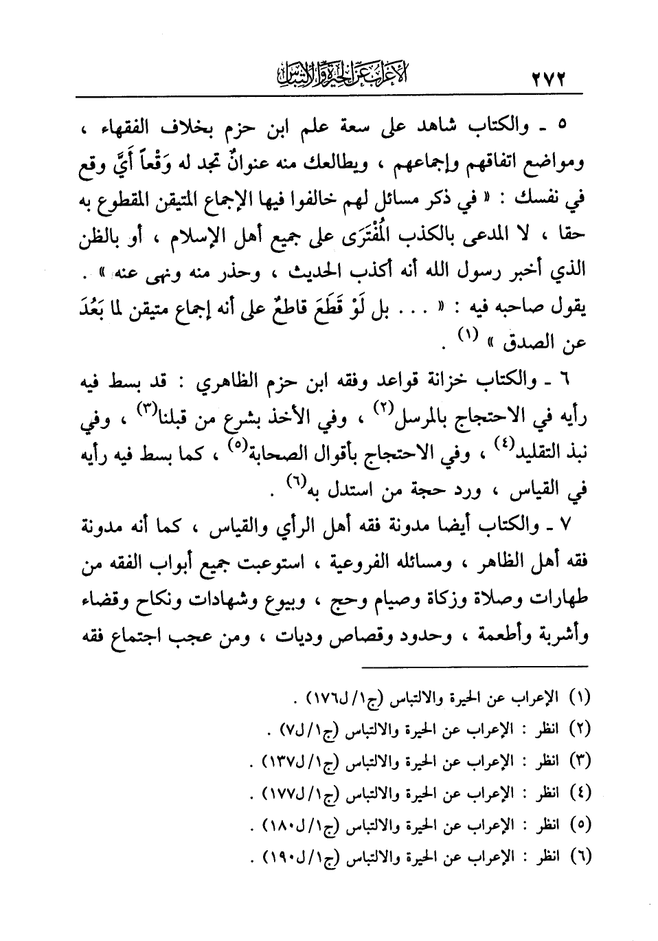 ¬٥ - والكتاب شاهد على سعة علم ابن حزم بخلاف الفقهاء، ومواضع اتفاقهم وإجماعهم، ويطالعك منه عنوانٌ تجد له وَقْعًا أَيَّ وقع في نفسك: "في ذكر مسائل لهم خالفوا فيها الإجماع المتيقن المقطوع به حقا، لا المدعى بالكذب المُفْتَرَى على جميع أهل الإسلام، أو بالظن الذي أخبر رسول الله أنه كذب الحديث، وحذر منه ونهى عنه". يقول صاحبه فيه: ". . . بل لَوْ قَطَعَ قاطعٌ على أنه إجماع متيقن لما بَعُدَ عن الصدق" (¬١).