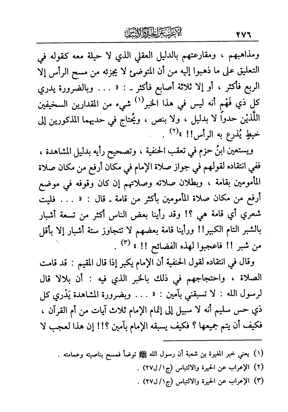 وقال في انتقاده لقول الحنفية أن الإمام يكبر إذا قال المقيم: قد قامت الصلاة، واحتجاجهم في ذلك بالخبر الذي فيه: أن بلالا قال لرسول الله: لا تسبقني بآمين: ". . . وبضرورة المشاهدة يَدْري كل ذي حس سليم أنه لا سبيل إلى إتمام الإمام ثلاث آيات من أم القرآن، فكيف أن يتم جميعها؟ فكيف يسبقه الإمام بآمين؟ ! ! إن هذا لعجب لا