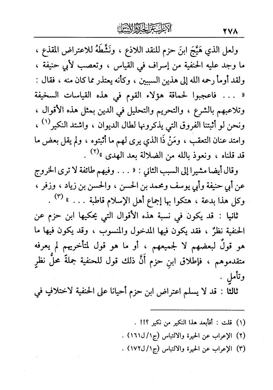 ثانيا: قد يكون في نسبة هذه الأقوال التي يحكيها ابن حزم عن الحنفية نظرٌ، فقد يكون فيها المدخول والمنسوب، وقد يكون فيها ما هو قولٌ لبعضهم لا لجميعهم، أو ما هو قول لمتأخريهم لم يعرفه متقدموهم، فإطلاق ابنِ حزم أَنَّ ذلك قول للحنفية جملةً محلُّ نظرٍ وتأملٍ.