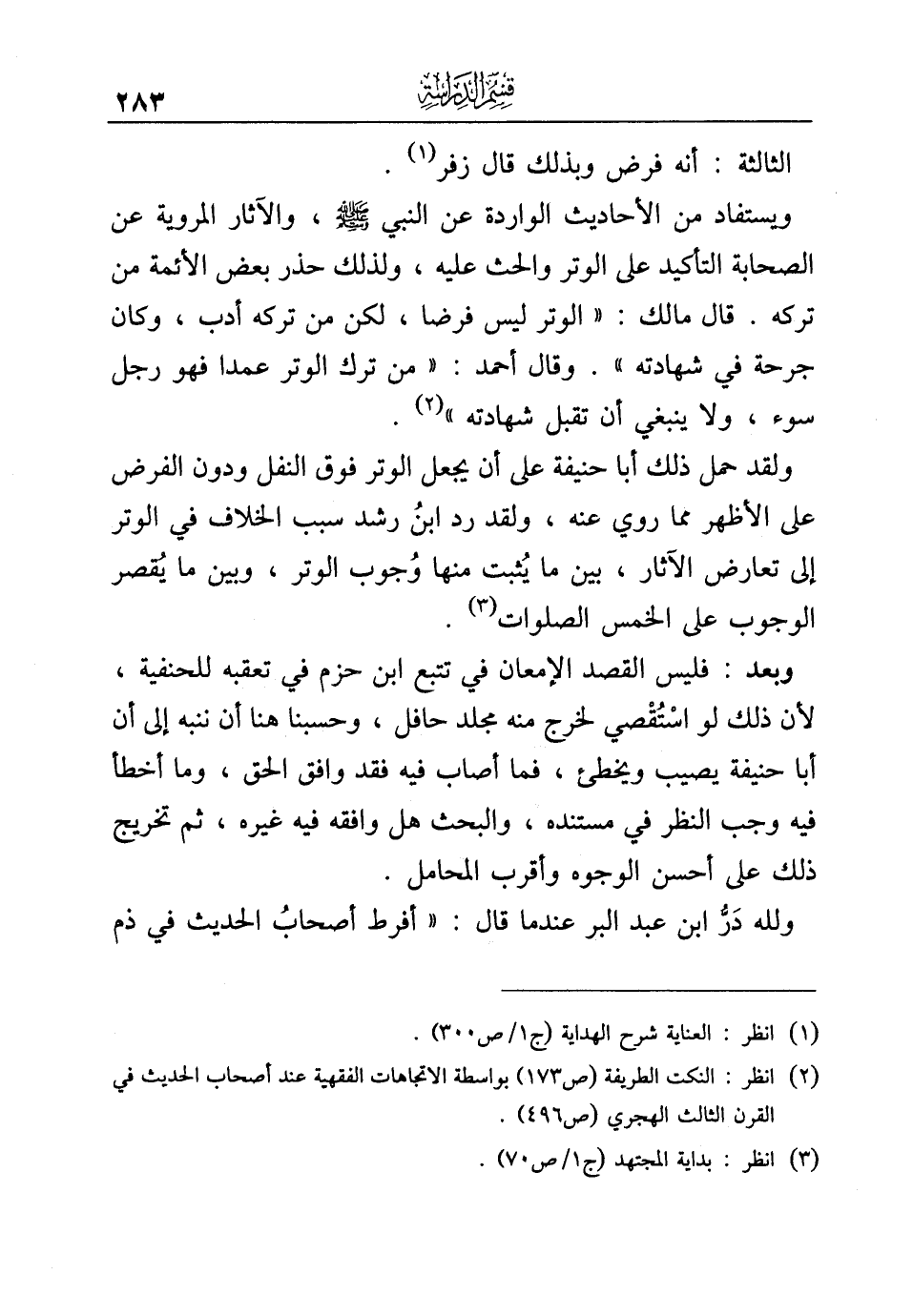 ولقد حمل ذلك أبا حنيفة على أن يجعل الوتر فوق النفل ودون الفرض على الأظهر مما روي عنه، ولقد رد ابنُ رشد سبب الخلاف في الوتر إلى تعارض الآثار، بين ما يُثبت منها وُجوب الوتر، وبين ما يُقصر الوجوب على الخمس الصلوات (¬٣).