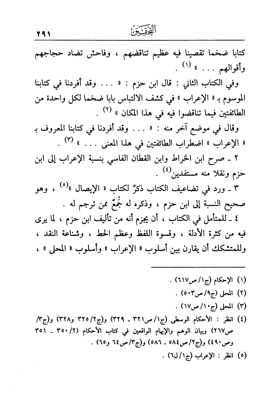 وفي الكتاب الثاني: قال ابن حزم: ". . . وقد أفردنا في كتابنا الموسوم بـ "الإعراب" في كشف الالتباس بابا ضخما لكل واحدة من الطائفتين فيما تناقضوا فيه في هذا المكان" (¬٢).