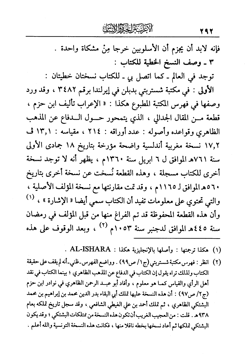 (¬٢) انظر: فهرس مكتبة شستربتي (ج ١/ ص ٩٩). وواضع الفهرس - ظني - أنه لم يقف على حقيقة الكتاب ولذلك تراه يقول إن الكتاب في الدفاع عن المذهب الظاهري؛ بينما الكتاب في نقد أهل الرأي والقياس كما هو معلوم، وأفاد أبو عبد الرحمن الظاهري في نوادر ابن حزم (ج ٢/ ص ٩٧): أن هذه النسخة عليها تملك أبي البقاء بدر الدين محمد بن إبراهيم بن محمد البشتكي الظاهري، ثم تملك أحمد بن علي الغيطي الشافعي، وقد سجل تاريخ تملكه بعام ٩٣٨ هـ. قلت: من العجيب الغريب أن تكون هذه النسخة من ممتلكات البشتكي؛ وقد يكون البشتكي تملكها ثم أعاد نسخها بخطه ناقلا منها، فكانت هذه النسخة التونسية والله أعلم.
