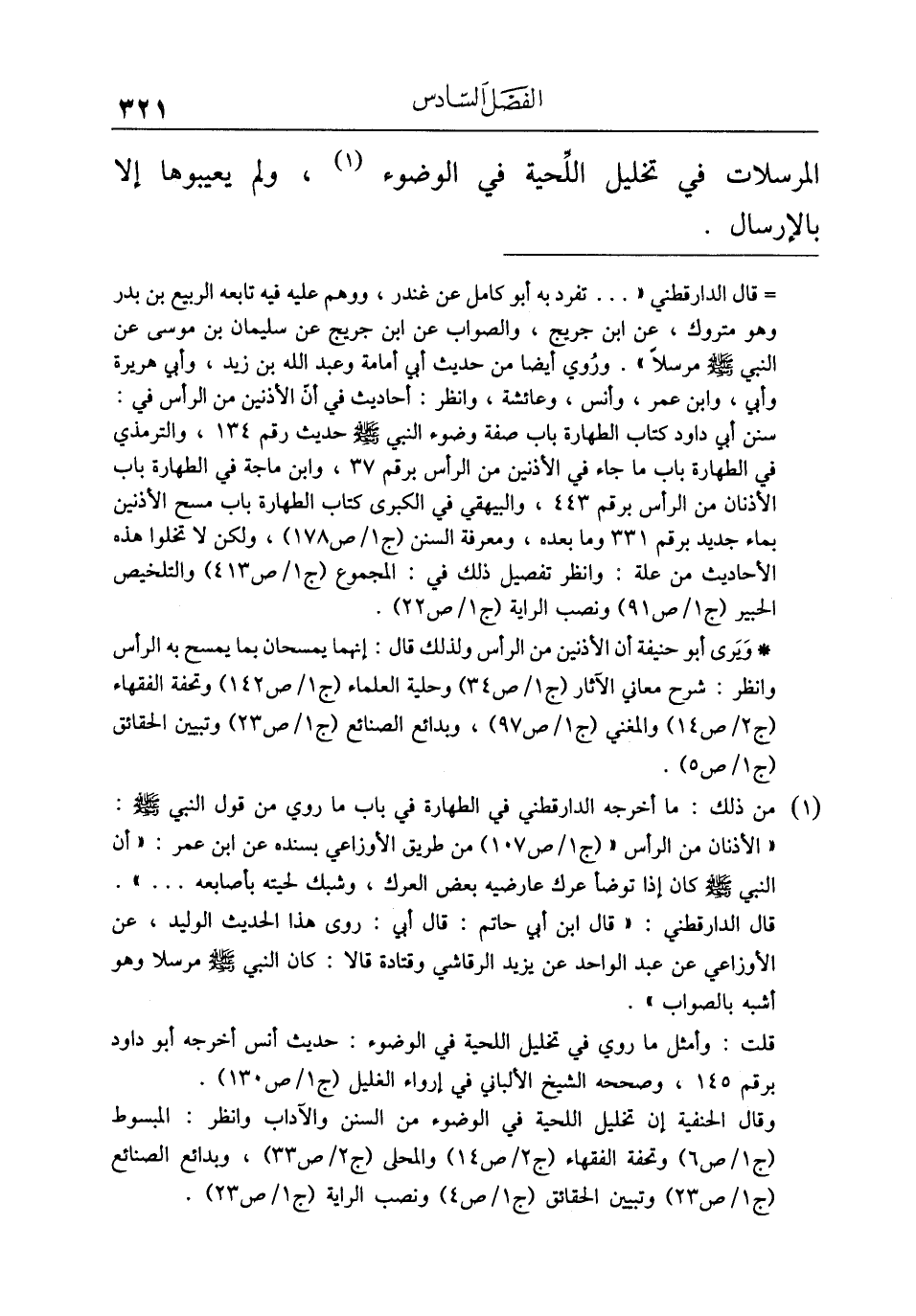 (¬١) من ذلك: ما أخرجه الدارقطني في الطهارة في باب ما روي من قول النبي -صلى الله عليه وسلم-: "الأذنان من الرأس" (ج ١ / ص ١٠٧) من طريق الأوزاعي بسنده عن ابن عمر: "أن النبي -صلى الله عليه وسلم- كان إذا توضأ عرك عارضيه بعض العرك، وشبك لحيته بأصابعه ... ".