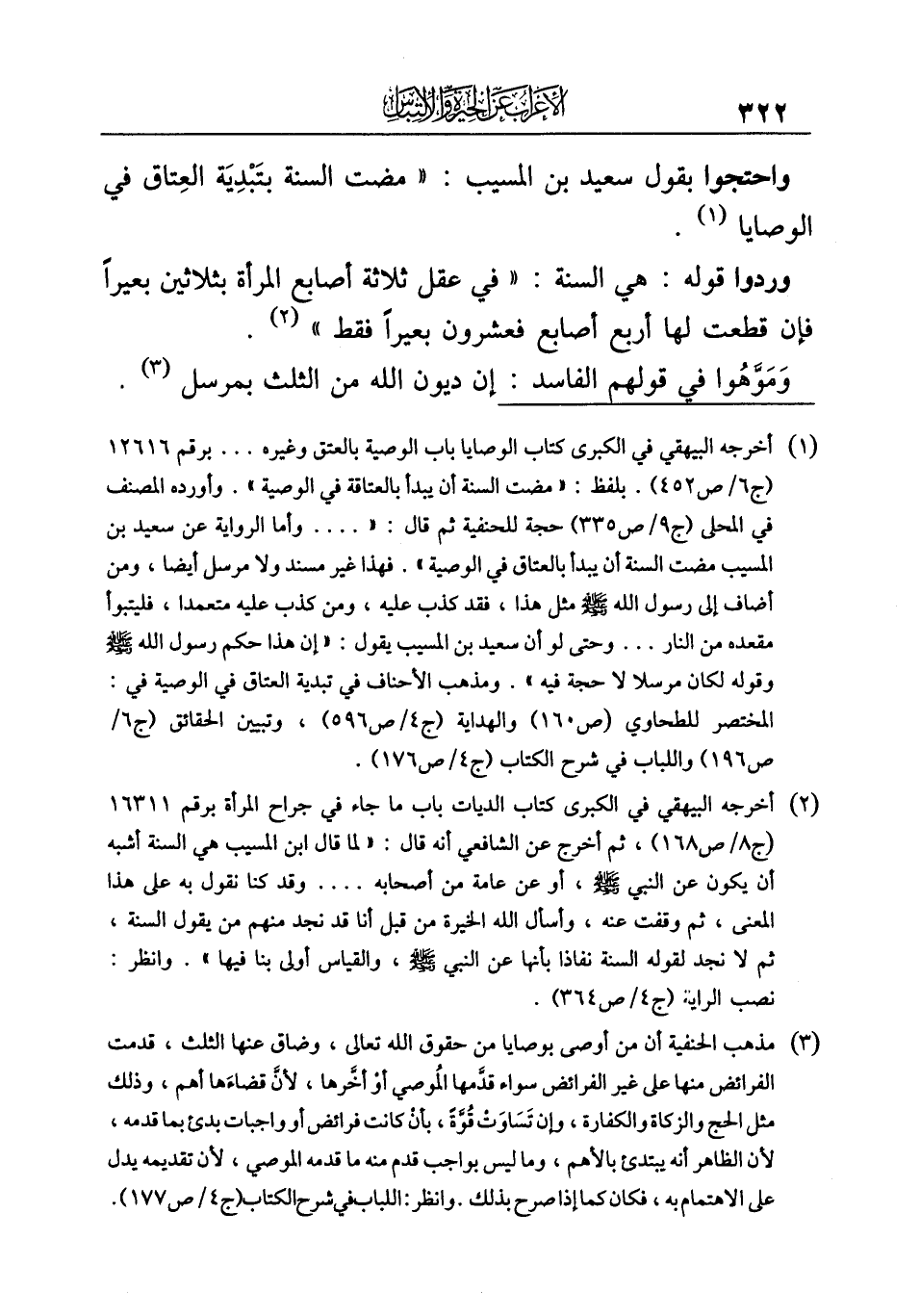 (¬١) أخرجه البيهقي في الكبرى كتاب الوصايا باب الوصية بالعتق وغيره ... برقم ١٢٦١٦ (ج ٦/ ص ٤٥٢). بلفظ: "مضت السنة أن يبدأ بالعتاقة في الوصية". وأورده المصنف في المحلى (ج ٩/ ص ٣٣٥) حجة للحنفية ثم قال: " .... وأما الرواية عن سعيد بن المسيب مضت السنة أن يبدأ بالعتاق في الوصية". فهذا غير مسند ولا مرسل أيضا، ومن أضاف إلى رسول الله -صلى الله عليه وسلم- مثل هذا، فقد كذب عليه، ومن كذب عليه متعمدا، فليتبوأ مقعده من النار ... وحتى لو أن سعيد بن المسيب يقول: "إن هذا حكم رسول الله -صلى الله عليه وسلم- وقوله لكان مرسلا لا حجة فيه". ومذهب الأحناف في تبدية العتاق في الوصية في: المختصر للطحاوي (ص ١٦٠) والهداية (ج ٤/ ص ٥٩٦)، وتبيين الحقائق (ج ٦/ ص ١٩٦) واللباب في شرح الكتاب (ج ٤/ ص ١٧٦).