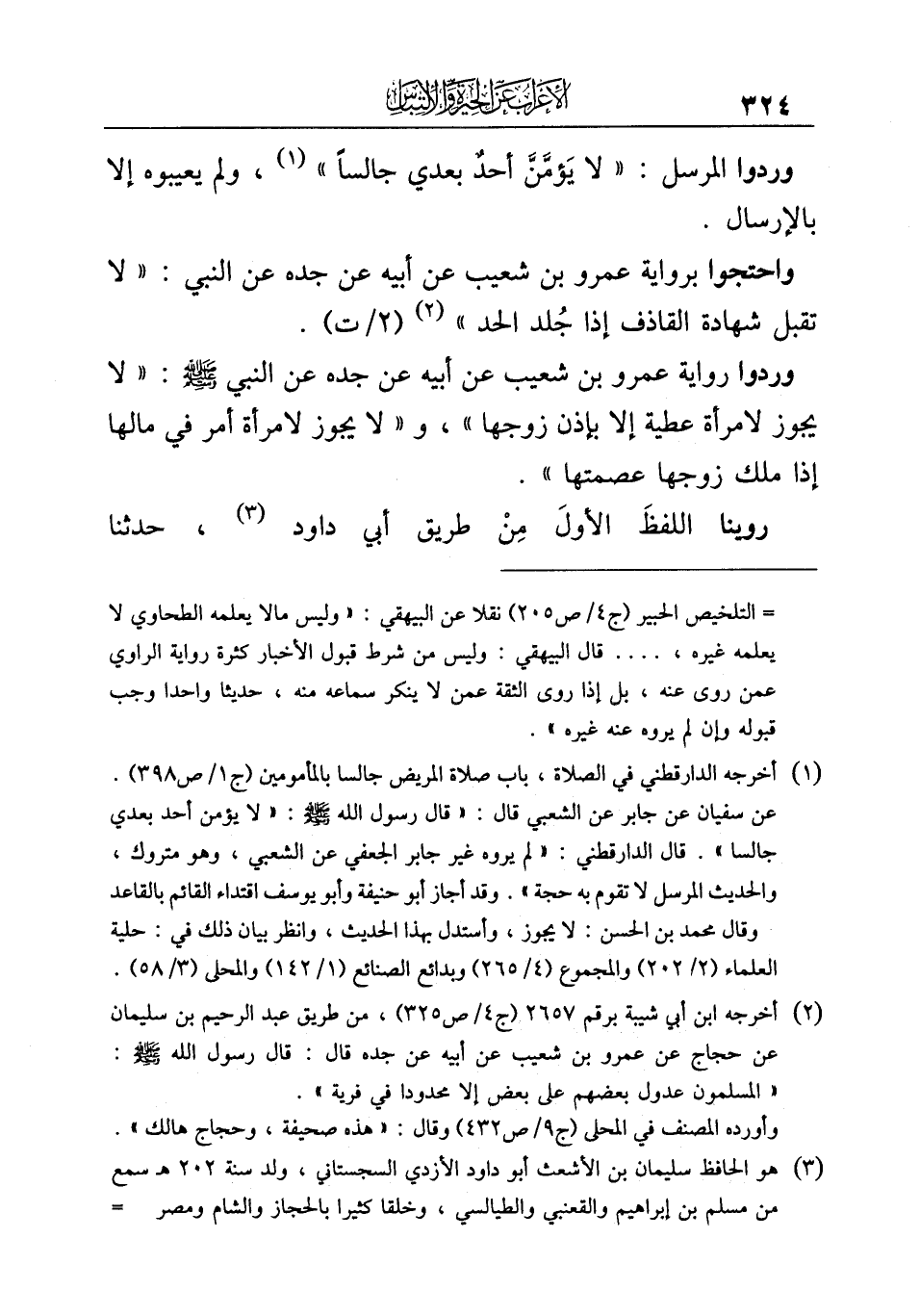 (¬٢) أخرجه ابن أبي شيبة برقم ٢٦٥٧ (ج ٤/ ص ٣٢٥)، من طريق عبد الرحيم بن سليمان عن حجاج عن عمرو بن شعيب عن أبيه عن جده قال: قال رسول الله -صلى الله عليه وسلم-: "المسلمون عدول بعضهم على بعض إلا محدودا في فرية".