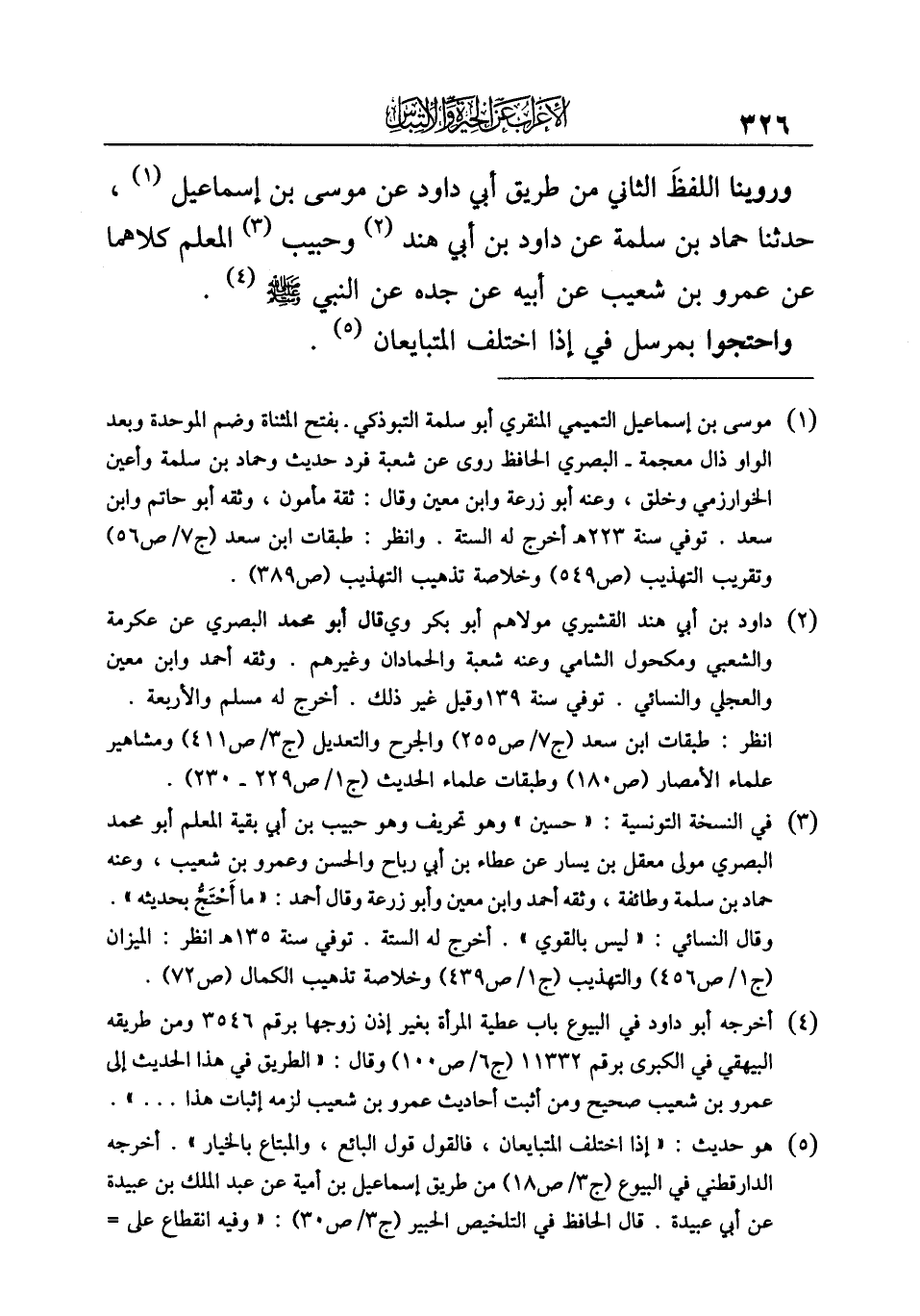 وروينا اللفظَ الثاني من طريق أبي داود عن موسى بن إسماعيل (¬١)، حدثنا حماد بن سلمة عن داود بن أبي هند (¬٢) وحبيب (¬٣) المعلم كلاهما عن عمرو بن شعيب عن أبيه عن جده عن النبي -صلى الله عليه وسلم- (¬٤).