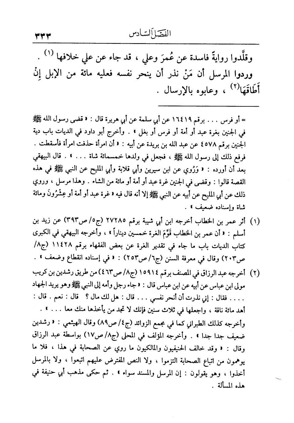 (¬١) أثر عمر بن الخطاب أخرجه ابن أبي شيبة برقم ٢٧٢٨٥ (ج ٥ / ص ٣٩٣) عن زيد بن أسلم: "أن عمر بن الخطاب قَوَّمَ الغرة خمسين دينارًا"، وأخرجه البيهقي في الكبرى كتاب الديات باب ما جاء في تقدير الغرة عن بعض الفقهاء برقم ١١٤٢٨ (ج ٨/ ص ٢٠٣) وقال في معرفة السنن (ج ٦/ ص ٢٥٣): "في إسناده انقطاع وضعف".