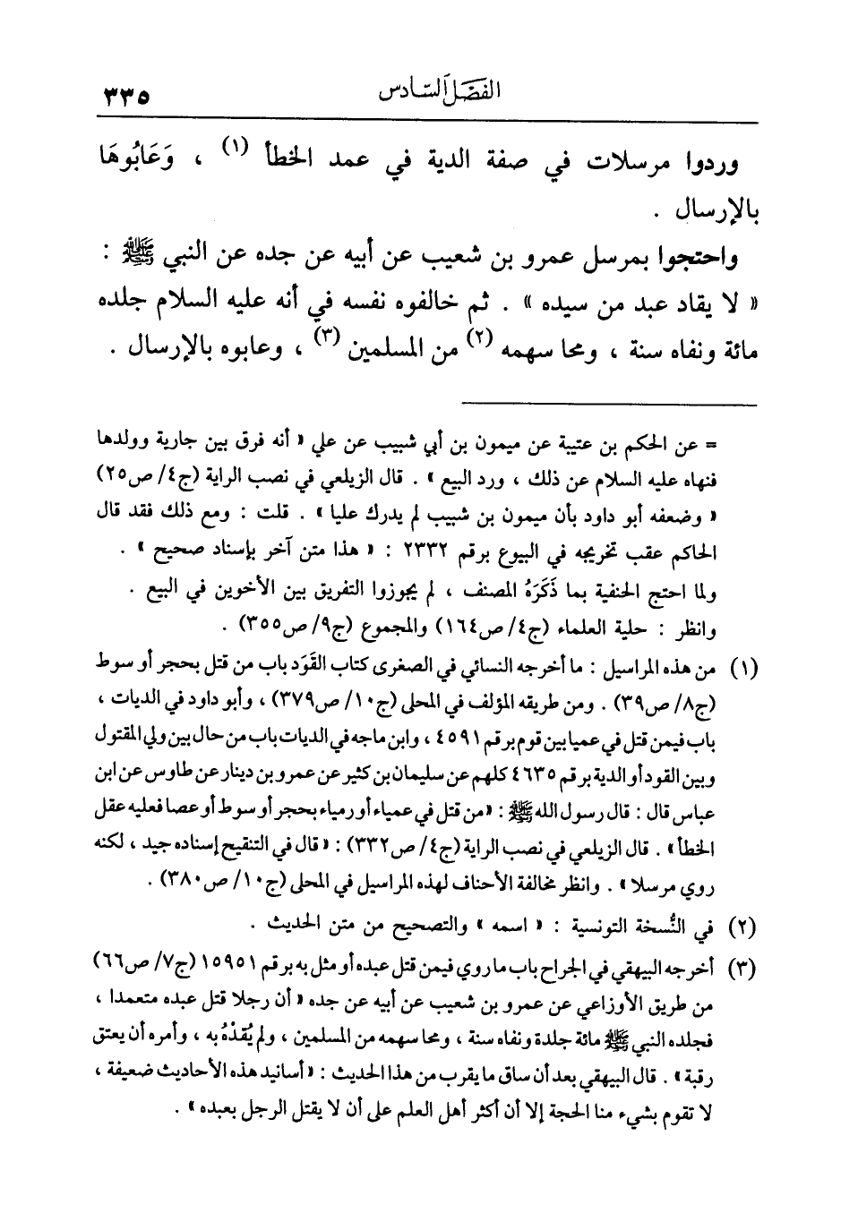 (¬١) من هذه المراسيل: ما أخرجه النسائي في الصغرى كتاب القَوَد باب من قتل بحجر أو سوط (ج ٨/ ص ٣٩). ومن طريقه المؤلف في المحلى (ج ١٠/ ص ٣٧٩)، وأبو داود في الديات، باب فيمن قتل في عميا بين قوم برقم ٤٥٩١، وابن ماجه في الديات باب من حال بين ولي المقتول وبين القود أو الدية برقم ٤٦٣٥ كلهم عن سليمان بن كثير عن عمرو بن دينار عن طاوس عن ابن عباس قال: قال رسول الله -صلى الله عليه وسلم-: "من قتل في عمياء أو رمياء بحجر أو سوط أو عصا فعليه عقل الخطأ". قال الزيلعي في نصب الراية (ج ٤/ ص ٣٣٢): "قال في التنقيح إسناده جيد، لكنه روي مرسلا". وانظر مخالفة الأحناف لهذه المراسيل في المحلى (ج ١٠/ ص ٣٨٠).