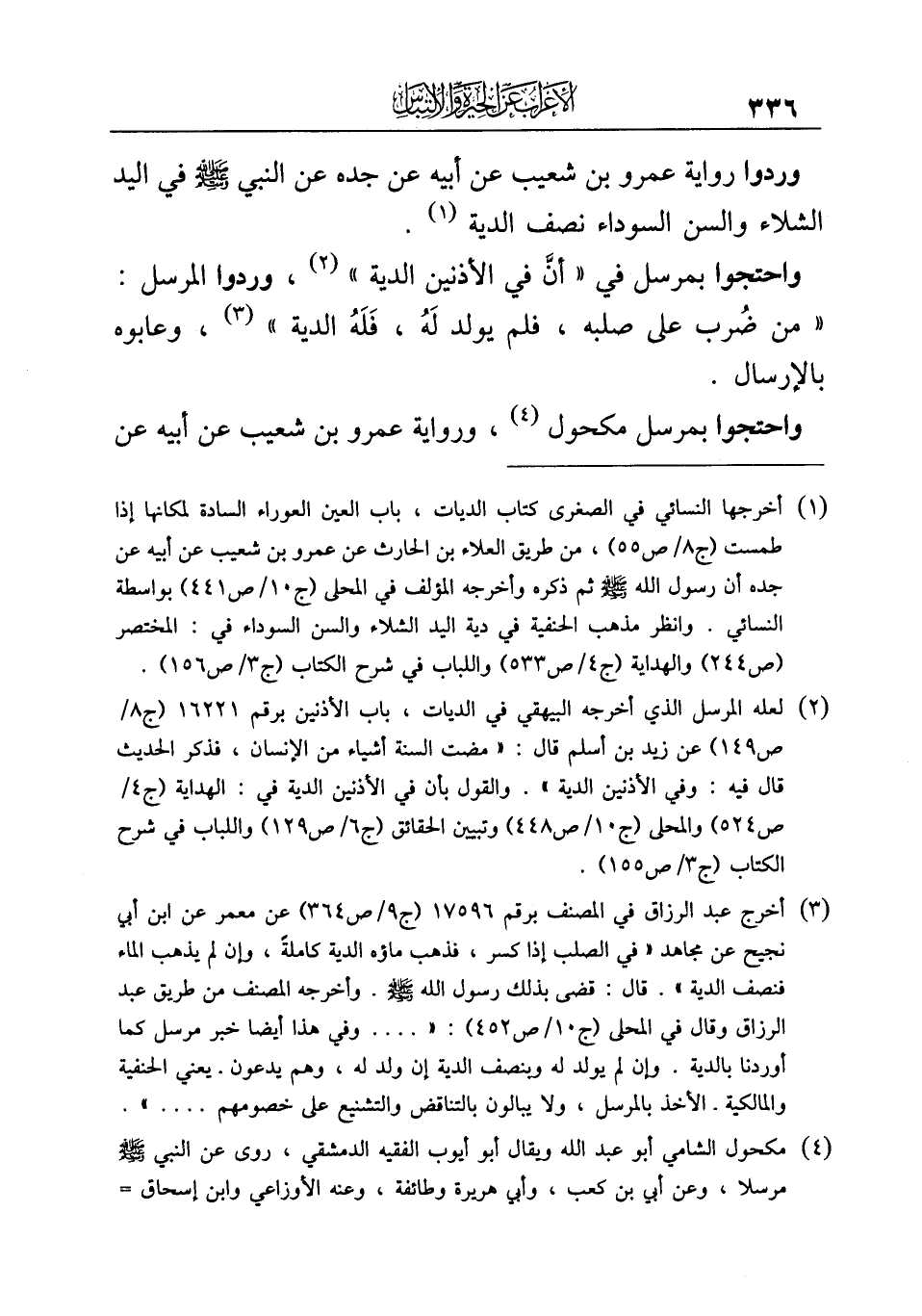 (¬٣) أخرج عبد الرزاق في المصنف برقم ١٧٥٩٦ (ج ٩/ ص ٣٦٤) عن معمر عن ابن أبي نجيح عن مجاهد "في الصلب إذا كسر، فذهب ماؤه الدية كاملةً، وإن لم يذهب الماء فنصف الدية". قال: قضى بذلك رسول الله -صلى الله عليه وسلم-. وأخرجه المصنف من طريق عبد الرزاق وقال في المحلى (ج ١٠ / ص ٤٥٢): " .... وفي هذا أيضا خبر مرسل كما أوردنا بالدية. وإن لم يولد له وبنصف الدية إن ولد له، وهم يدعون -يعني الحنفية والمالكية- الأخذ بالمرسل، ولا يبالون بالتناقض والتشنيع على خصومهم ..... ".