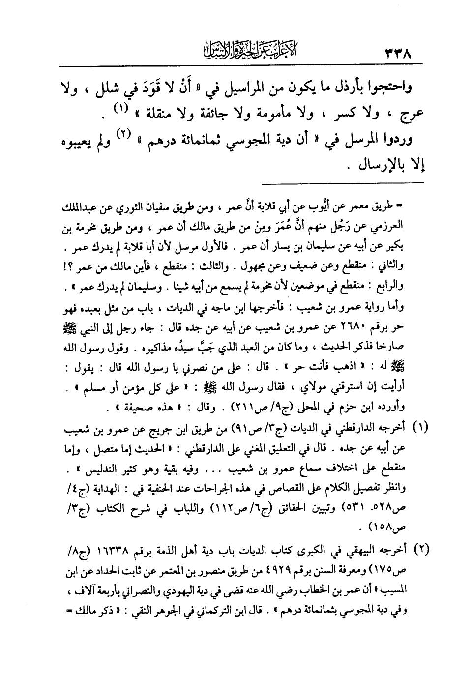 (¬١) أخرجه الدارقطني في الديات (ج ٣/ ص ١٩) من طريق ابن جريج عن عمرو بن شعيب عن أبيه عن جده. قال في التعليق المغني على الدارقطني: "الحديث إما متصل، وإما منقطع على اختلاف سماع عمرو بن شعيب ... وفيه بقية وهو كثير التدليس".