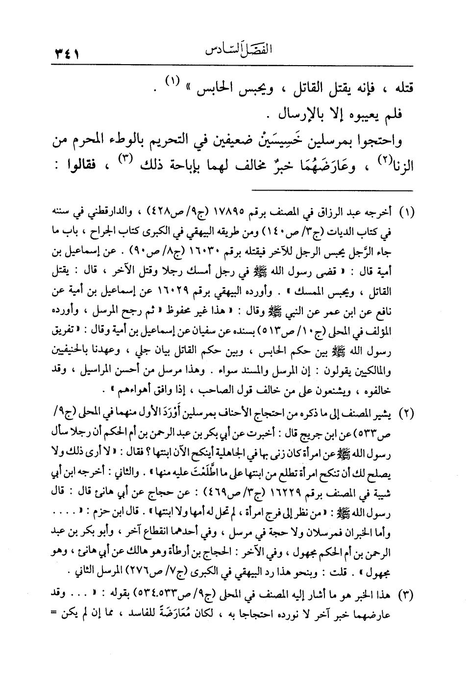 (¬١) أخرجه عبد الرزاق في المصنف برقم ١٧٨٩٥ (ج ٩/ ص ٤٢٨)، والدارقطني في سننه في كتاب الديات (ج ٣/ ص ١٤٠) ومن طريقه البيهقي في الكبرى كتاب الجراح، باب ما جاء الرَّجل يحبس الرجل للآخر فيقتله برقم ١٦٠٣٠ (ج ٨/ ص ٩٠). عن إسماعيل بن أمية قال: "قضى رسول الله -صلى الله عليه وسلم- في رجل أمسك رجلا وقتل الآخر، قال: يقتل القاتل، ويحبس الممسك". وأورده البيهقي برقم ١٦٠٢٩ عن إسماعيل بن أمية عن نافع عن ابن عمر عن النبي -صلى الله عليه وسلم- وقال: "هذا غير محفوظ" ثم رجح المرسل، وأورده المؤلف في المحلى (ج ١٠/ ص ٥١٣) بسنده عن سفيان عن إسماعيل بن أمية وقال: "تفريق رسول الله -صلى الله عليه وسلم- بين حكم الحابس، وبين حكم القاتل بيان جلي، وعهدنا بالحنيفيين والمالكيين يقولون: إن المرسل والمسند سواء. وهذا مرسل من أحسن المراسيل، وقد خالفوه، ويشنعون على من خالف قول الصاحب، إذا وافق أهواءهم".