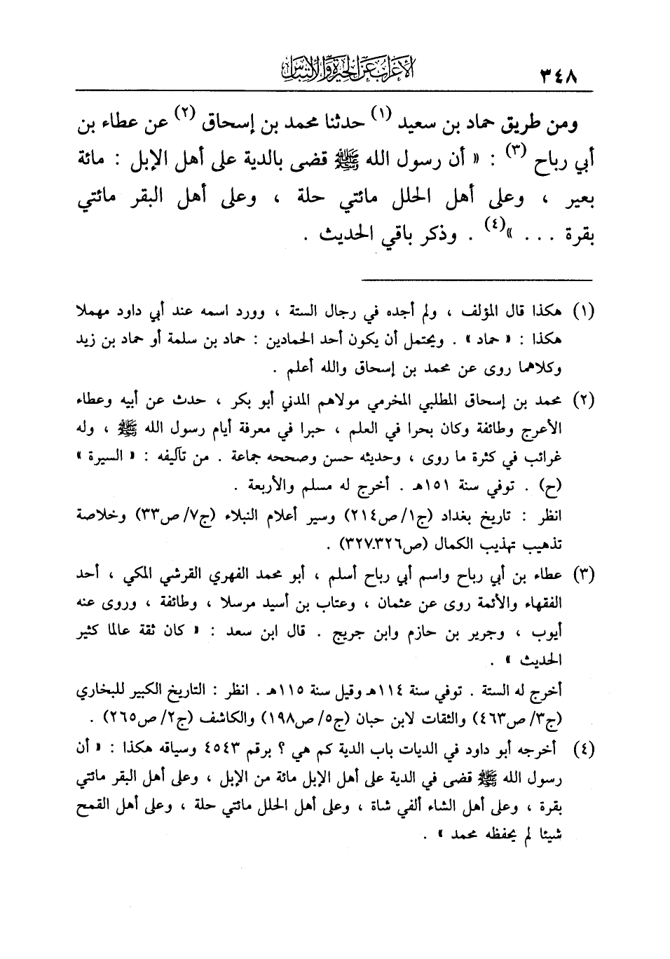 ومن طريق حماد بن سعيد (¬١) حدثنا محمد بن إسحاق (¬٢) عن عطاء بن أبي رباح (¬٣): "أن رسول الله -صلى الله عليه وسلم- قضى بالدية على أهل الإبل: مائة بعير، وعلى أهل الحلل مائتي حلة، وعلى أهل البقر مائتي بقرة ... " (¬٤). وذكر باقي الحديث.