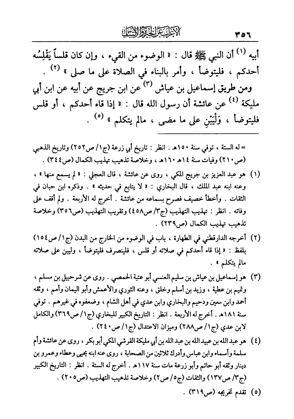 ومن طريق إسماعيل بن عياش (¬٣) عن ابن جريج عن أبيه عن ابن أبي مليكة (¬٤) عن عائشة أن رسول الله قال: "إذا قاء أحدكم، أو قلس فليتوضأ، وَلْيَبْنِ على ما مضى، ما لم يتكلم" (¬٥).