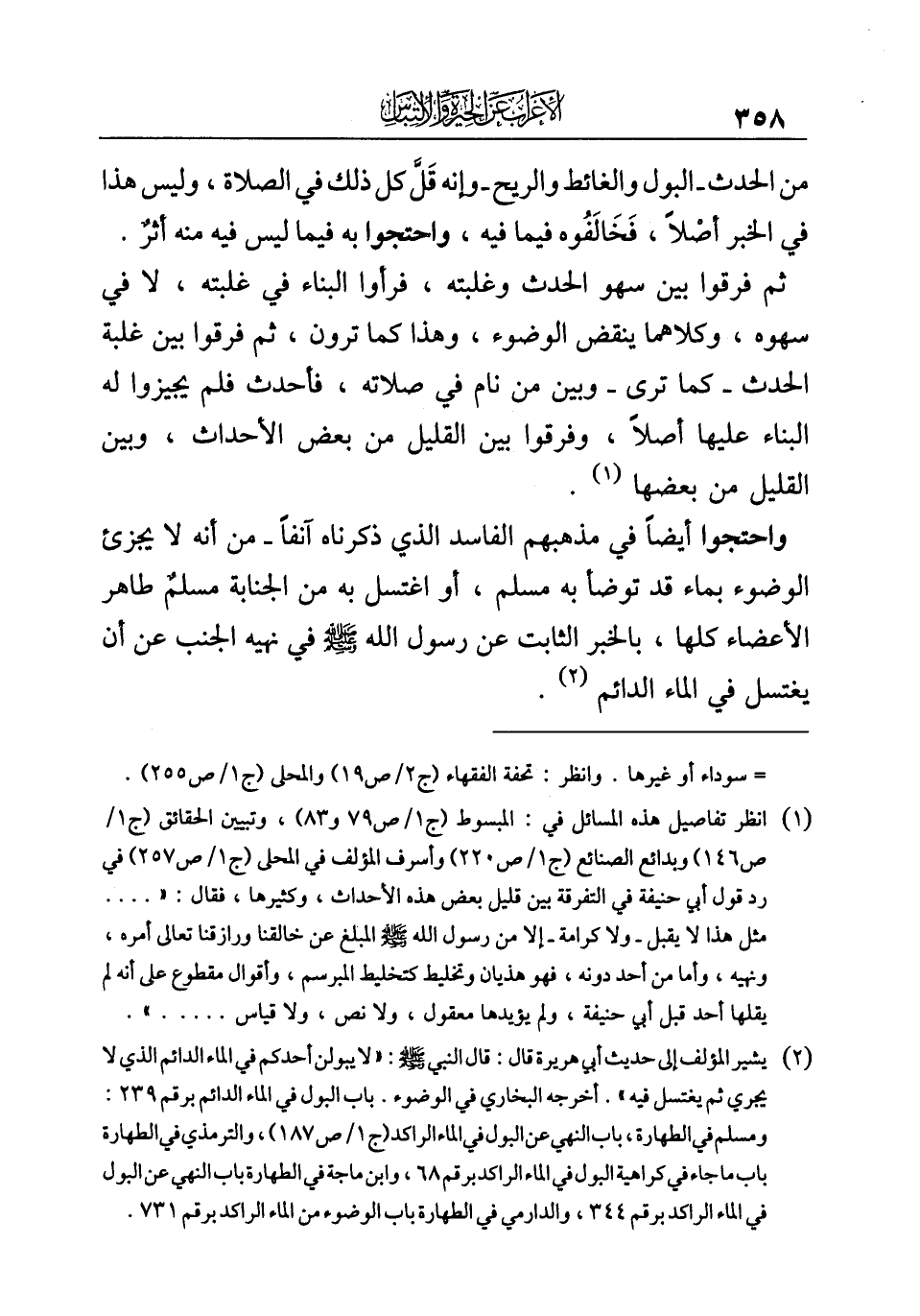 (¬١) انظر تفاصيل هذه المسائل في: المبسوط (ج ١/ ص ٧٩ و ٨٣)، وتبيين الحقائق (ج ١/ ص ١٤٦) وبدائع الصنائع (ج ١/ ص ٢٢٠) وأسرف المؤلف في المحلى (ج ١/ ص ٢٥٧) في رد قول أبي حنيفة في التفرقة بين قليل بعض هذه الأحداث، وكثيرها، فقال: " .... مثل هذا لا يقبل -ولا كرامة- إلا من رسول الله -صلى الله عليه وسلم- المبلغ عن خالقنا ورازقنا تعالى أمره، ونهيه، وأما من أحد دونه، فهو هذيان وتخليط كتخليط المبرسم، وأقوال مقطوع على أنه لم يقلها أحد قبل أبي حنيفة، ولم يؤيدها معقول، ولا نص، ولا قياس ..... ".