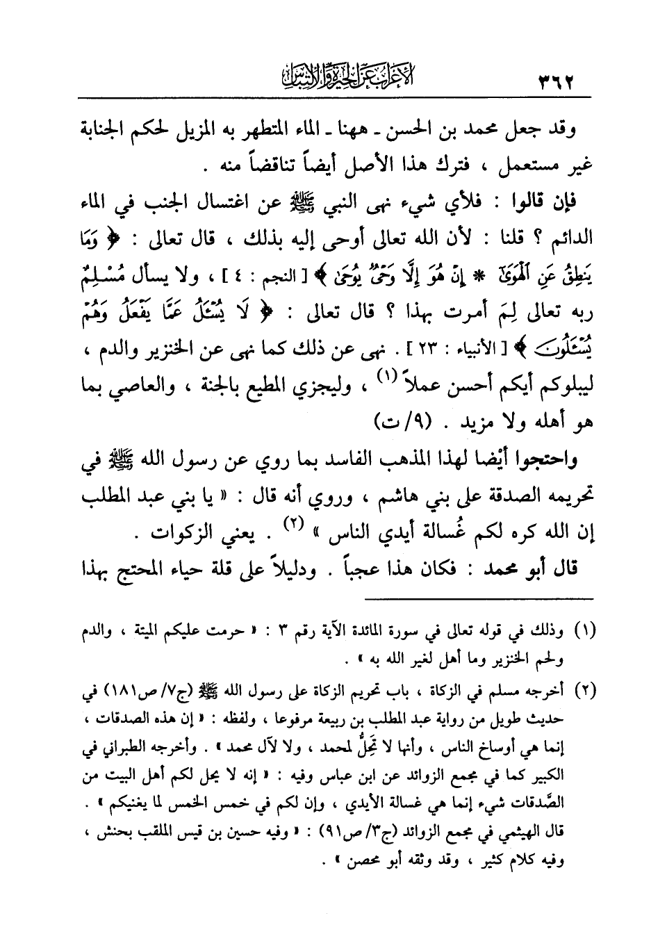 واحتجوا أيْضا لهذا المذهب الفاسد بما روي عن رسول الله -صلى الله عليه وسلم- في تحريمه الصدقة على بني هاشم، وروي أنه قال: "يا بني عبد المطلب إن الله كره لكم غُسالة أيدي الناس" (¬٢). يعني الزكوات.