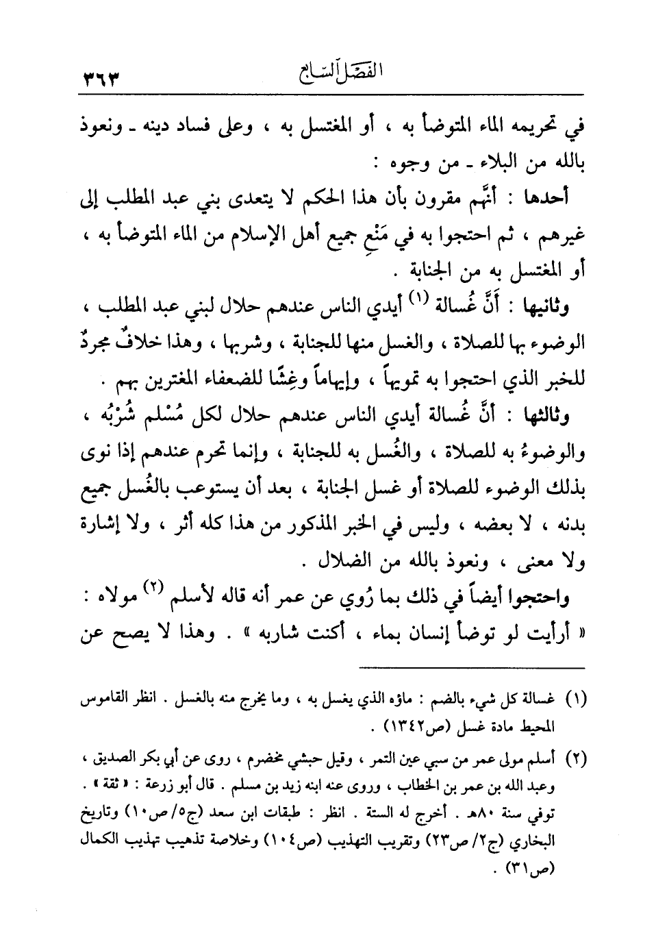 وثالثها: أنَّ غُسالة أيدي الناس عندهم حلال لكل مُسْلم شُرْبُه، والوضوءُ به للصلاة، والغُسل به للجنابة، وإنما تحرم عندهم إذا نوى بذلك الوضوء للصلاة أو غسل الجنابة، بعد أن يستوعب بالغُسل جميع بدنه، لا بعضه، وليس في الخبر المذكور من هذا كله أثر، ولا إشارة ولا معنى، ونعوذ بالله من الضلال.