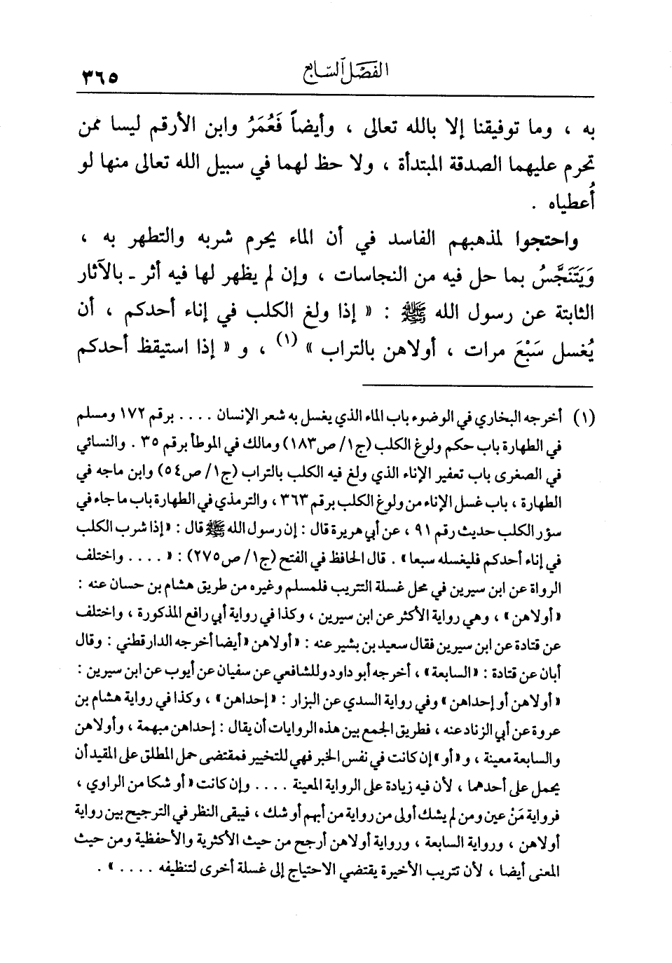 (¬١) أخرجه البخاري في الوضوء باب الماء الذي يغسل به شعر الإنسان .... برقم ١٧٢ ومسلم في الطهارة باب حكم ولوغ الكلب (ج ١/ ص ١٨٣) ومالك في الموطأ برقم ٣٥. والنسائي في الصغرى باب تعفير الإناء الذي ولغ فيه الكلب بالتراب (ج ١/ ص ٥٤) وابن ماجه في الطهارة، باب غسل الإناء من ولوغ الكلب برقم ٣٦٣، والترمذي في الطهارة باب ما جاء في سؤر الكلب حديث رقم ٩١، عن أبي هريرة قال: إن رسول الله -صلى الله عليه وسلم- قال: "إذا شرب الكلب في إناء أحدكم فليغسله سبعا". قال الحافظ في الفتح (ج ١/ ص ٢٧٥): " .... واختلف الرواة عن ابن سيرين في محل غسلة التتريب فلمسلم وغيره من طريق هشام بن حسان عنه: "أولاهن"، وهي رواية الأكثر عن ابن سيرين، وكذا في رواية أبي رافع المذكورة، واختلف عن قتادة عن ابن سيرين فقال سعيد بن بشير عنه: "أولاهن" أيضا أخرجه الدارقطني: وقال أبان عن قتادة: "السابعة"، أخرجه أبو داود وللشافعي عن سفيان عن أيوب عن ابن سيرين: "أولاهن أو إحداهن" وفي رواية السدي عن البزار: "إحداهن"، وكذا في رواية هشام بن عروة عن أبي الزناد عنه، فطريق الجمع بين هذه الروايات أن يقال: إحداهن مبهمة، وأولاهن والسابعة معينة، و"أو" إن كانت في نفس الخبر فهي للتخيير فمقتضى حمل المطلق على المقيد أن يحمل على أحدهما، لأن فيه زيادة على الرواية المعينة .... وإن كانت "أو شكا من الراوي، فرواية مَنْ عين ومن لم يشك أولى من رواية من أبهم أو شك، فيبقى النظر في الترجيح بين رواية أولاهن، ورواية السابعة، ورواية أولاهن أرجح من حيث الأكثرية والأحفظية ومن حيث المعنى أيضا، لأن تتريب الأخيرة يقتضي الاحتياج إلى غسلة أخرى لتنظيفه .... ".