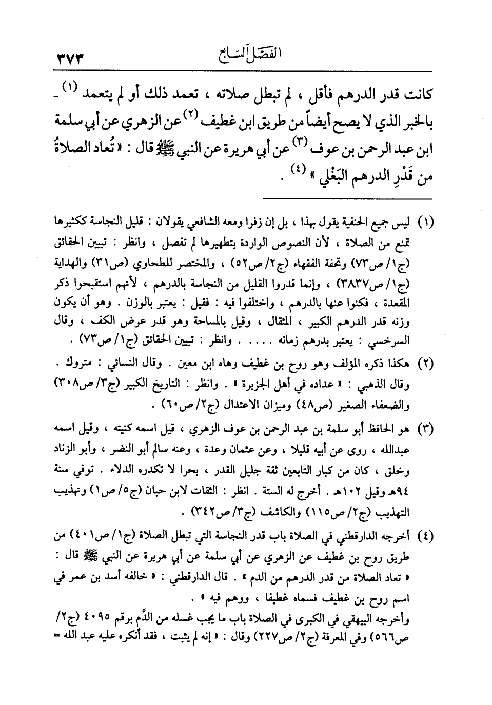 (¬٤) أخرجه الدارقطني في الصلاة باب قدر النجاسة التي تطل الصلاة (ج ١ / ص ٤٠١) من طريق روح بن غطيف عن الزهري عن أبي سلمة عن أبي هريرة عن النبي -صلى الله عليه وسلم- قال: "تعاد الصلاة من قدر الدرهم من الدم". قال الدارقطني: "خالفه أسد بن عمر في اسم روح بن غطيف فسماه غطيفا، ووهم فيه".