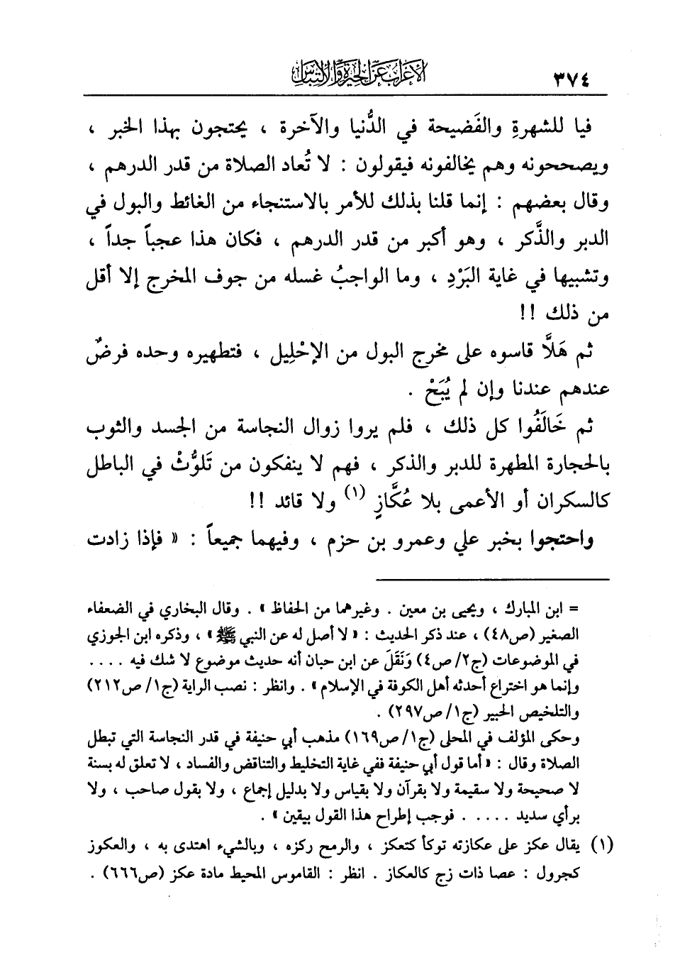 فيا للشهرةِ والفَضيحة في الدُّنيا والآخرة، يحتجون بهذا الخبر، ويصححونه وهم يخالفونه فيقولون: لا تُعاد الصلاة من قدر الدرهم، وقال بعضهم: إنما قلنا بذلك للأمر بالاستنجاء من الغائط والبول في الدبر والذَّكر، وهو أكبر من قدر الدرهم، فكان هذا عجبًا جدًا، وتشبيها في غاية البَرْدِ، وما الواجبُ غسله من جوف المخرج إلا أقل من ذلك! !